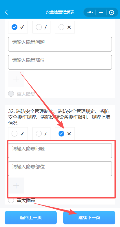6.创建好检查计划后,点击填写检查记录,在相应的隐患点击“X”,填写隐患问题、隐患部位上传照片附件点击“继续下一页”,直到出现“下发通知”按钮。