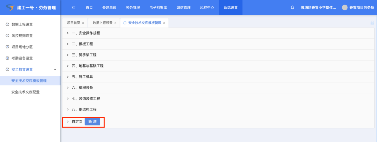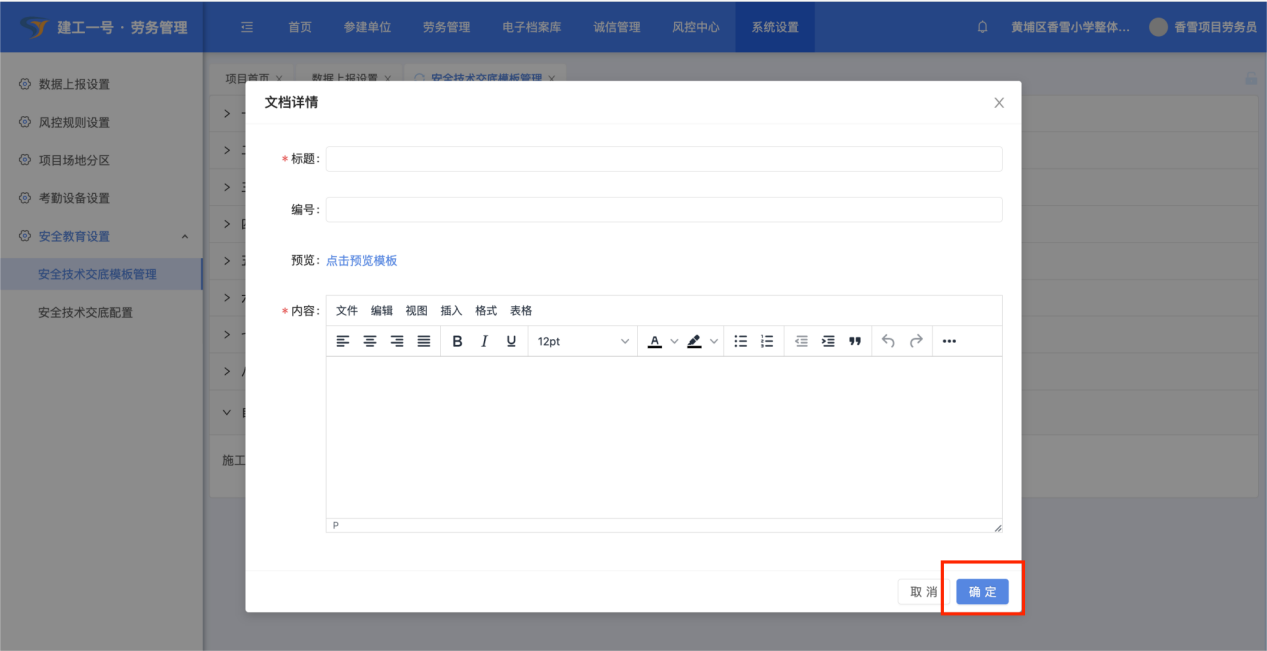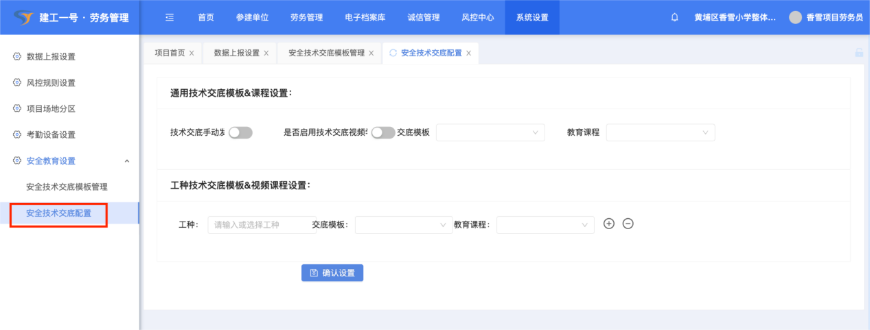 (1)点击【系统设置】-【安全教育设置】,安全技术交底模版管理和安全技术交底配置,是对工人入场后进行技术交底教育的模版编辑和配置。