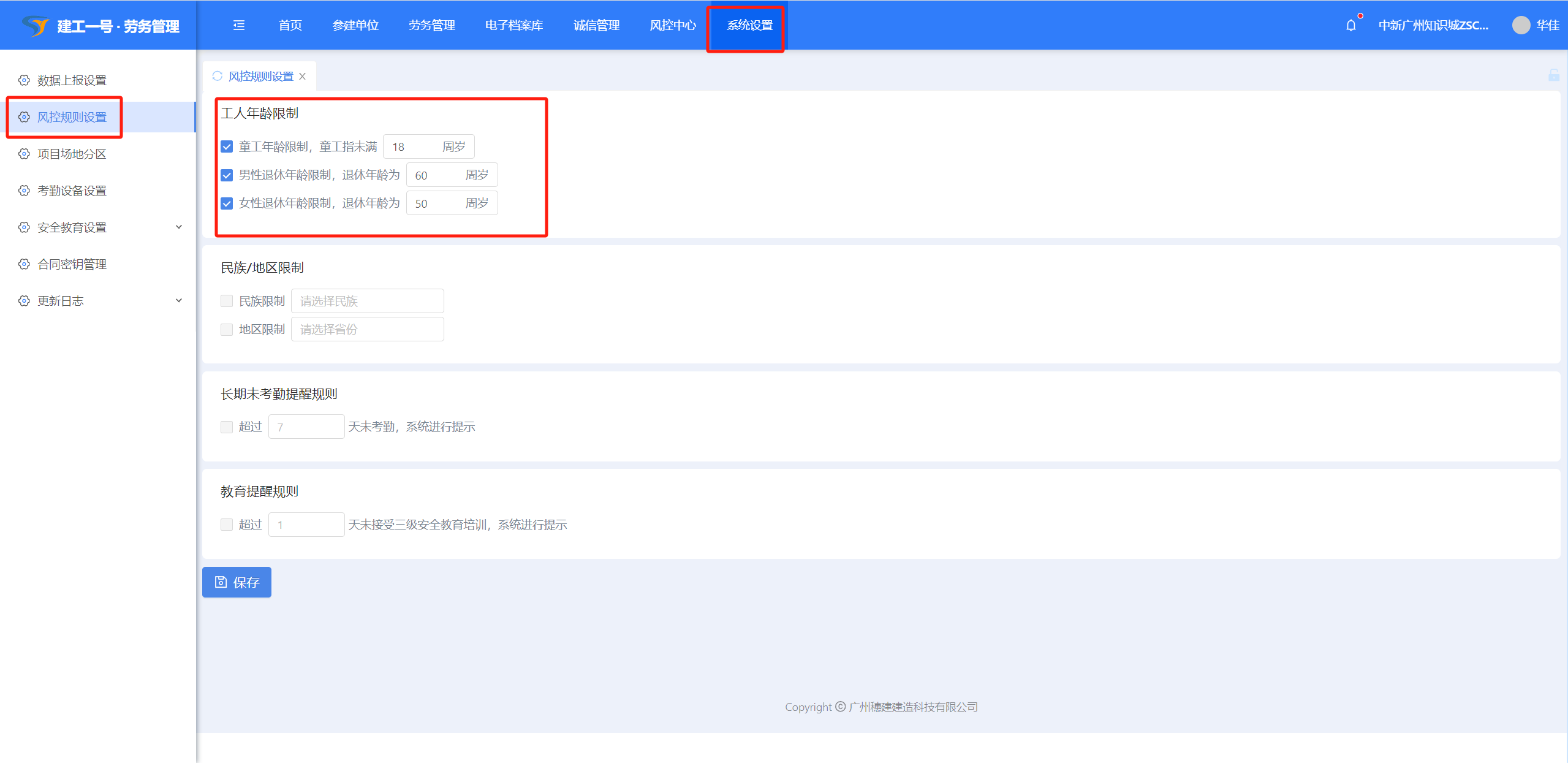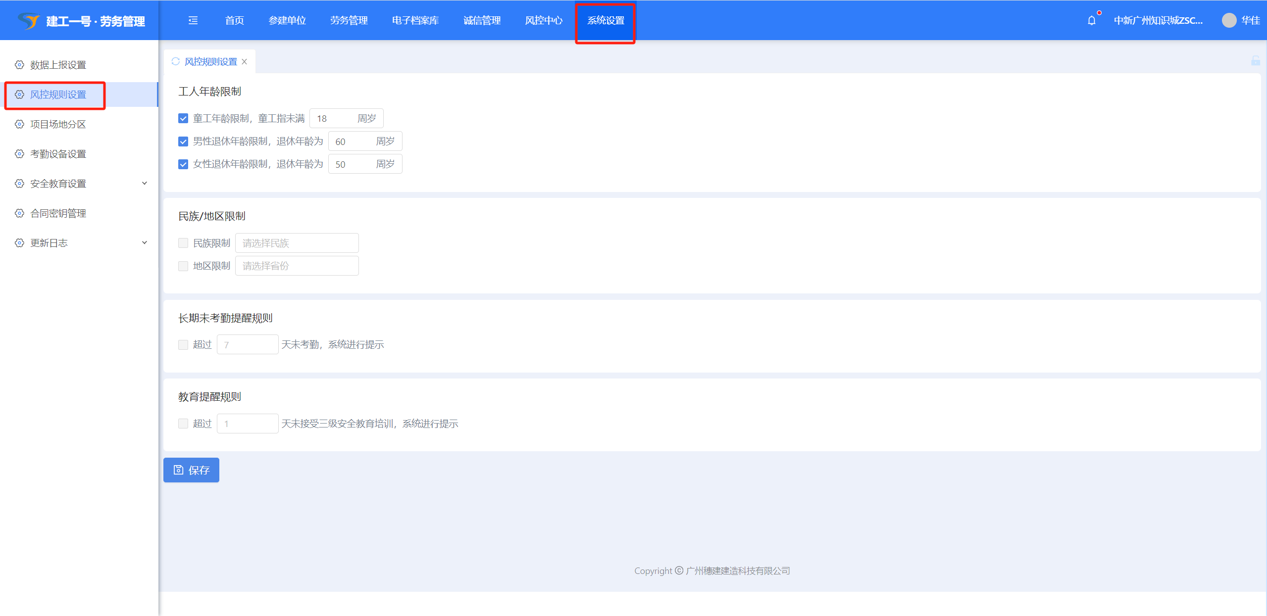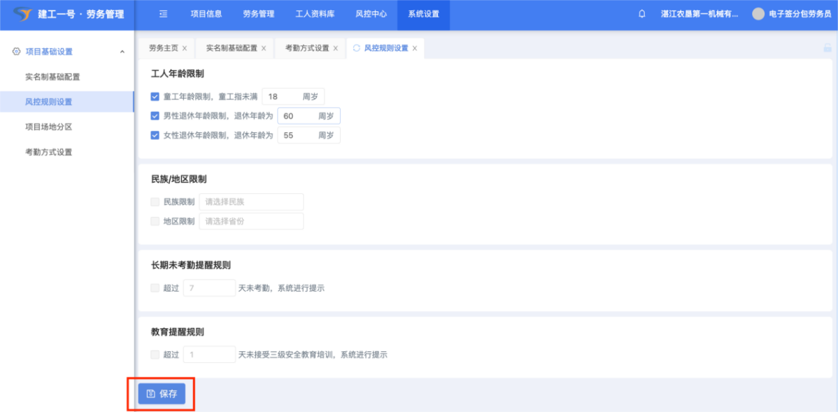 (1)点击【系统设置】-【风控规则设置】,风控规则设置对工人人员进场时设置风控提醒设置。