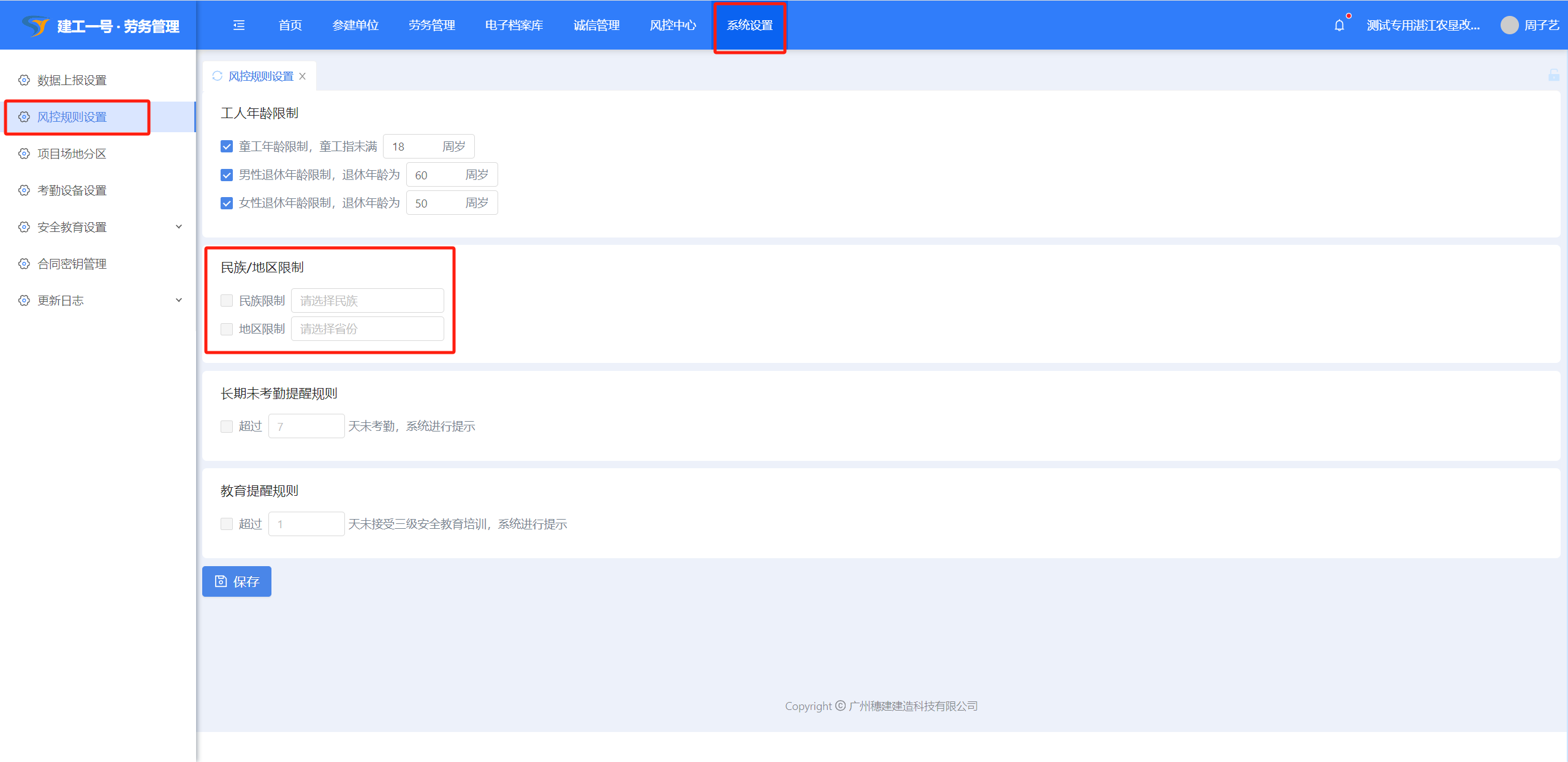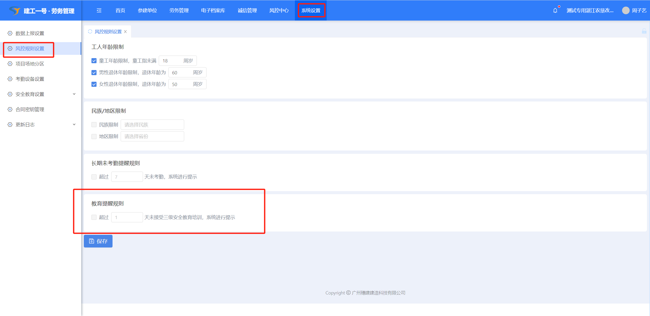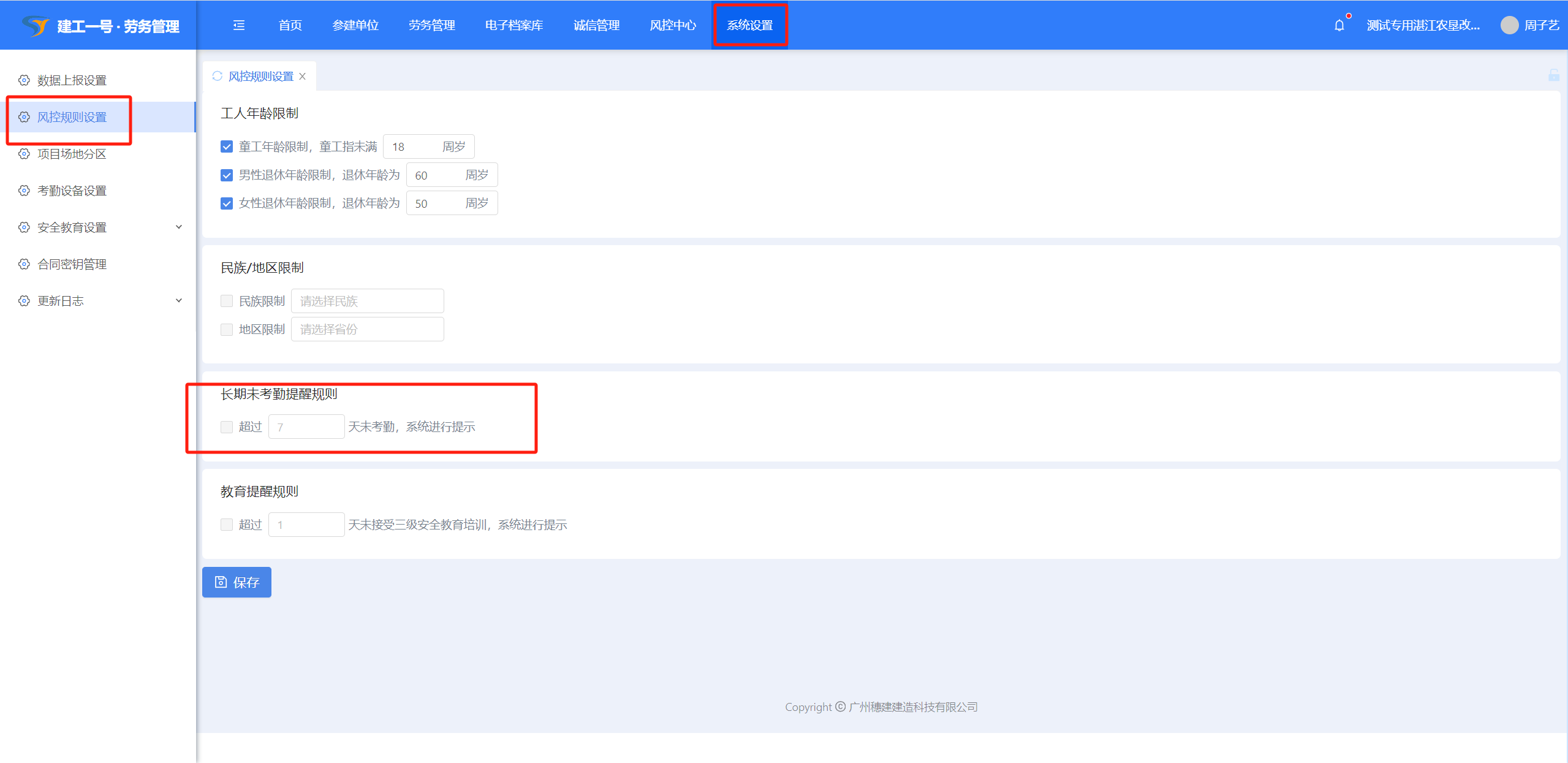 (1)点击【系统设置】-【风控规则设置】,风控规则设置对工人人员进场时设置风控提醒设置。