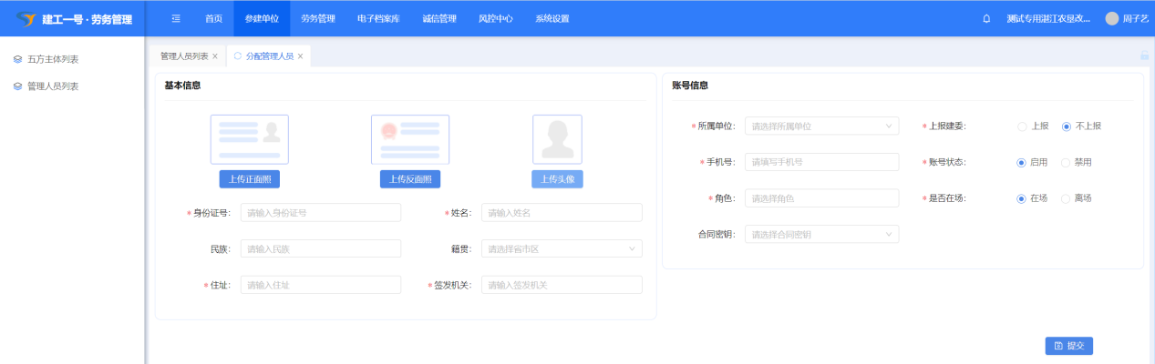 (5)选择所属单位、角色,输入手机号(如果该手机号没有注册过建工管理,则会生成默认密码Sjkj131452.),点击“提交”完成添加管理人员。