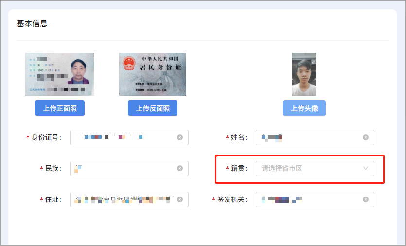 (4)核对从身份证图片识别出来的信息,选择籍贯。