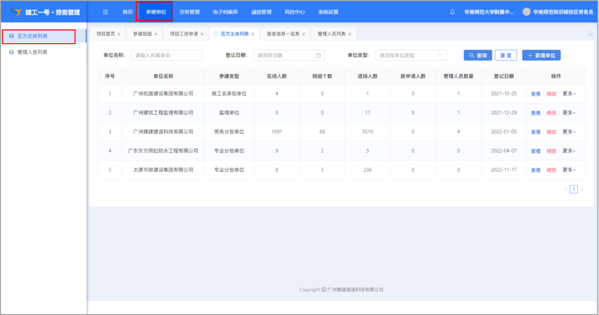 (1)点击【参建单位】-【五方主体列表】打开五方主体列表界面。