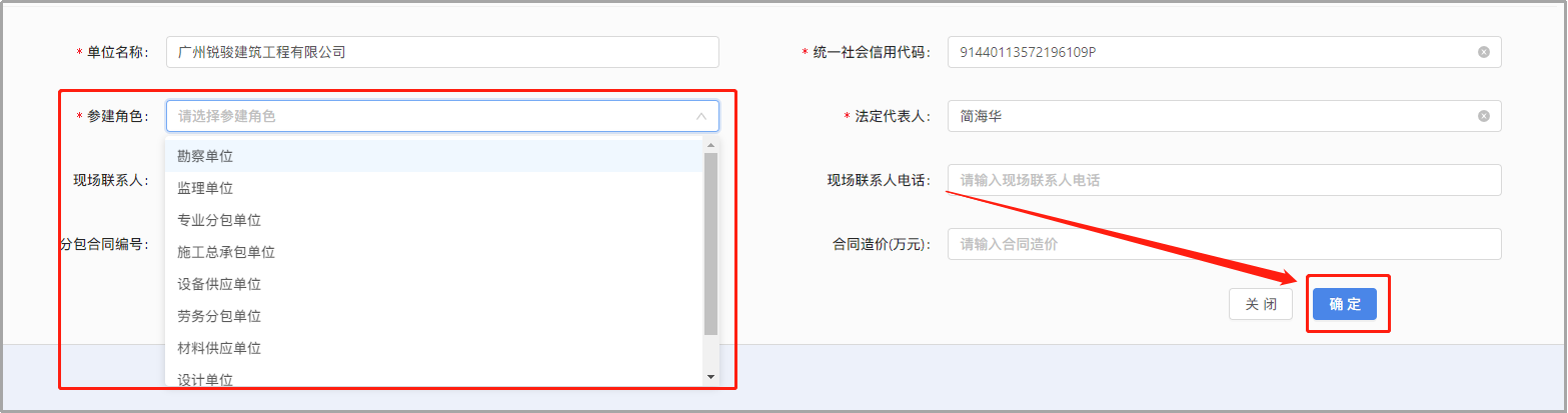 (5)选择该单位的参建角色,点击“确定”完成添加参建单位。
