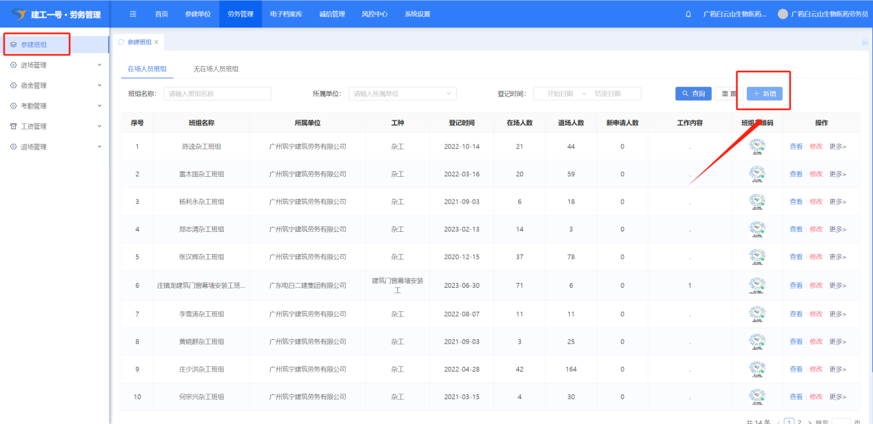 (1)点击系统上方菜单栏【劳务管理】-【参建班组】进入班组列表页面,点击“新增”按钮然后弹出新增班组弹框。