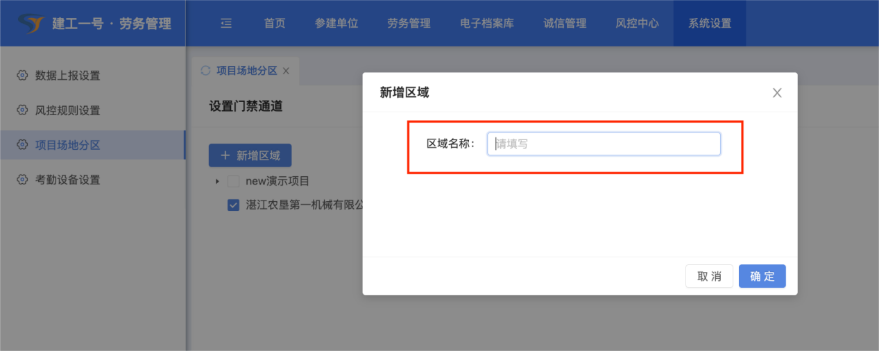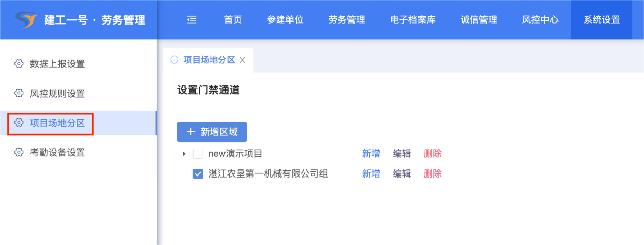 (1)点击【系统设置】-【项目场地分区】考勤机设备安置点区域设置。