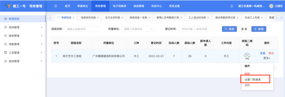(3)为添加好的班组设置门禁通道,先点击【更多】-【设置门禁通道】。