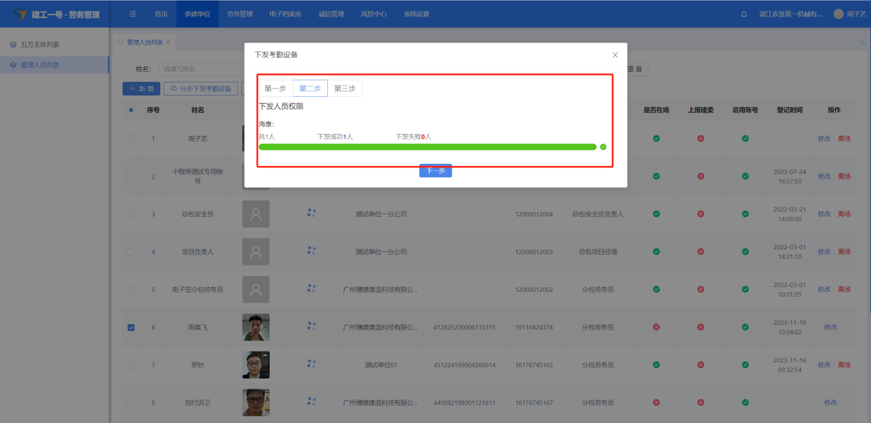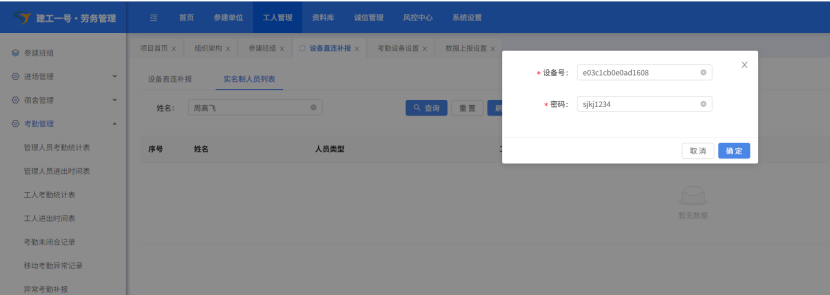 勾选工人,点击“下发考勤设备”-“确定”,进行人员信息下发考勤设备。
