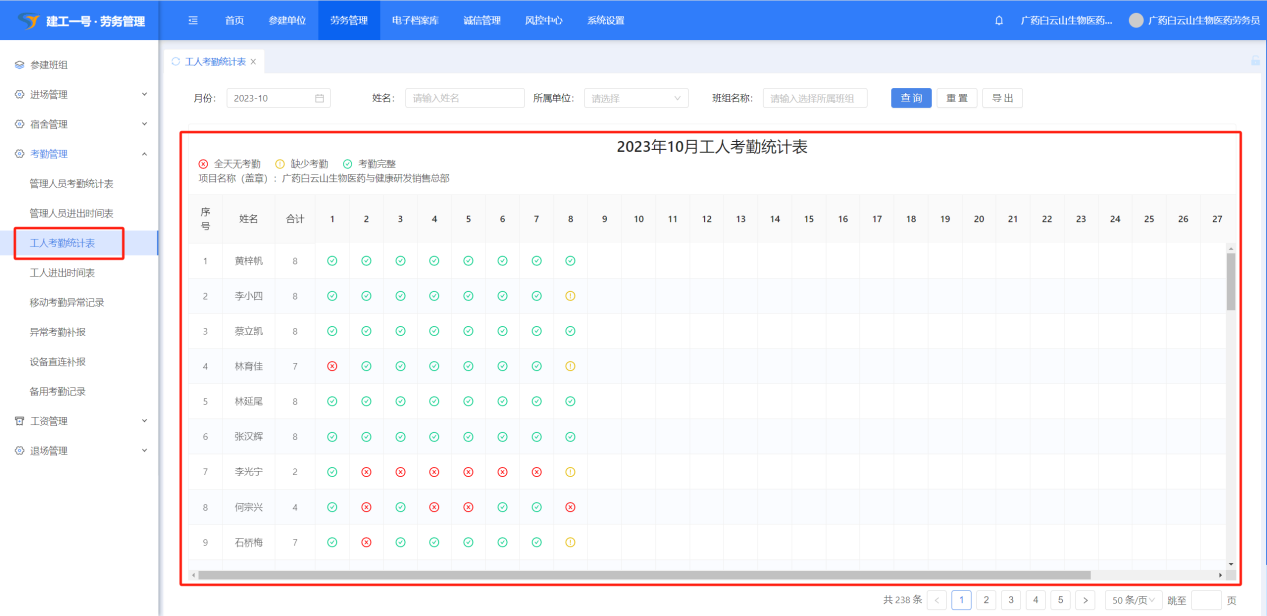 打开【劳务管理】-【考勤管理】-【工人考勤统计表】,可以筛选班组和月份查看工人考勤统计情况