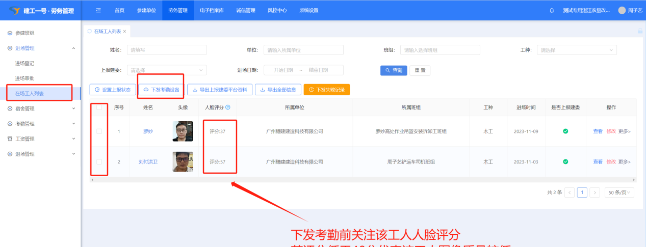 注:下发考勤设备前请查看该工人人像评分