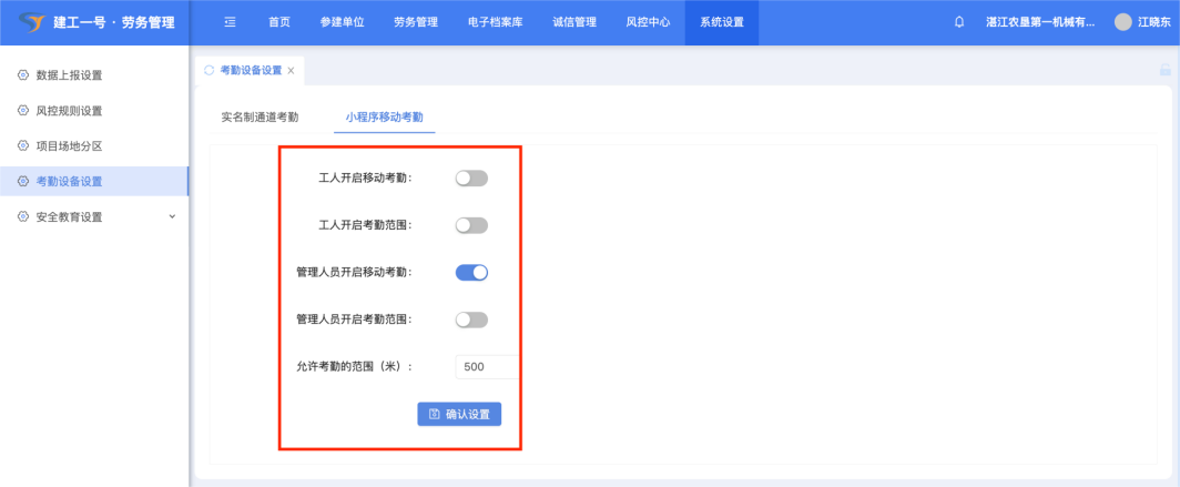 点击【系统设置】-【考勤设备设置】-【小程序移动考勤】