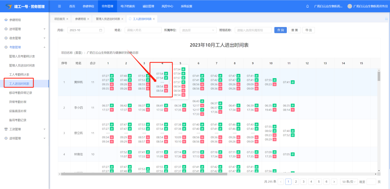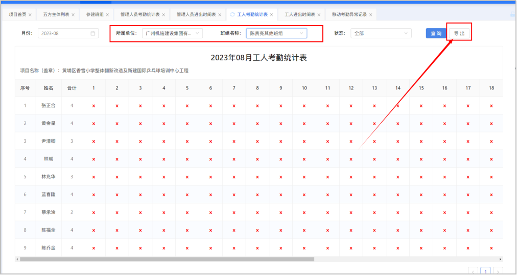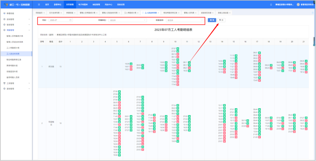 (1)选择月份、所属单位、班组名称,点击“导出”可以导出进出时间表。