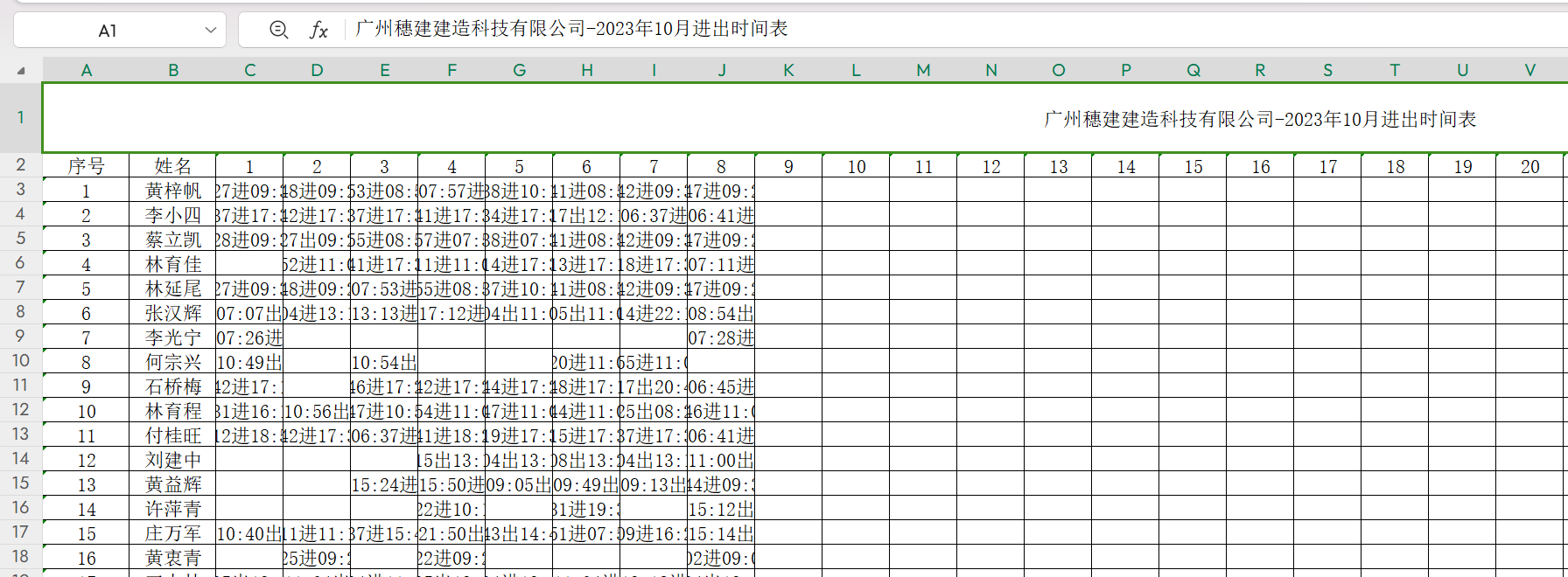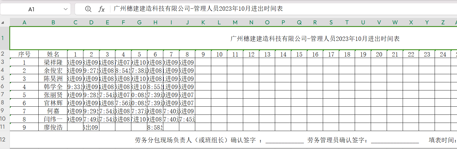 7.工人考勤进出时间表