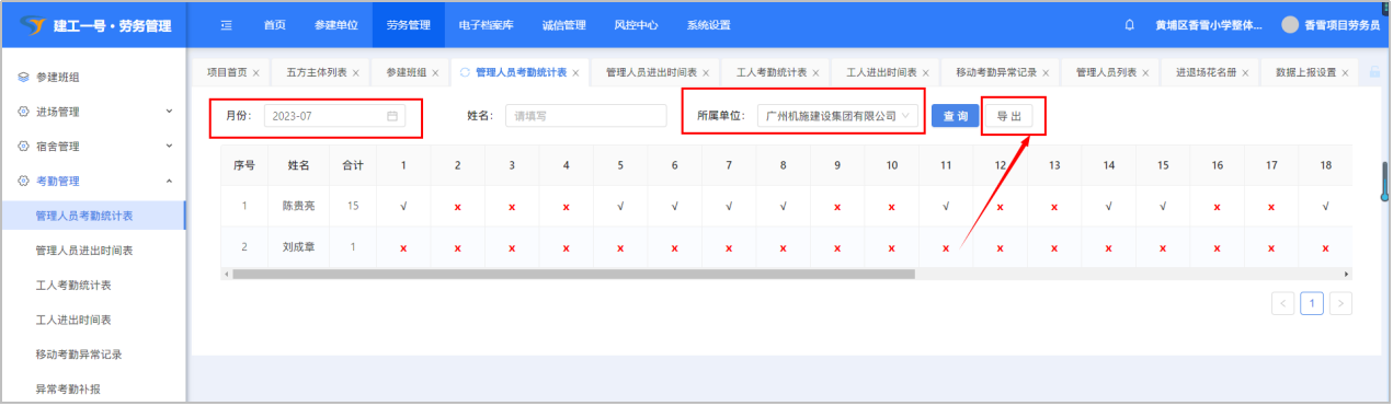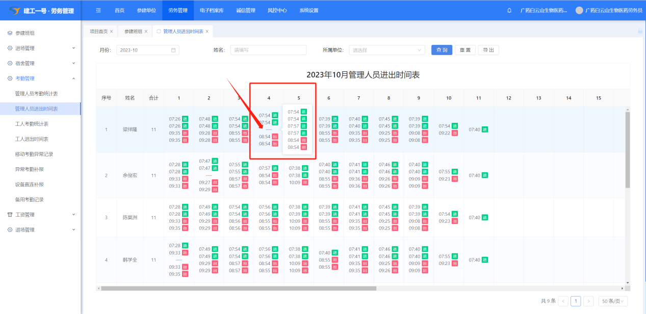 打开【劳务管理】-【考勤管理】-【管理人员进出时间表】,可以筛选月份和所属单位查看管理人员考勤明细,会显示打卡时间和进出场标识。