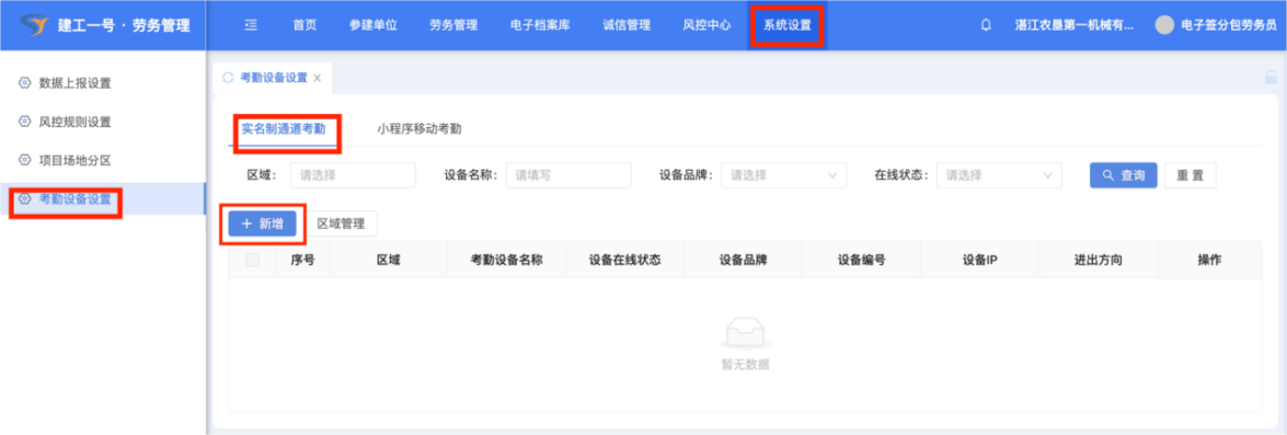点击【系统设置】-【考勤设备设置】-【实名制通道考勤】,对通道考勤机进行管理。