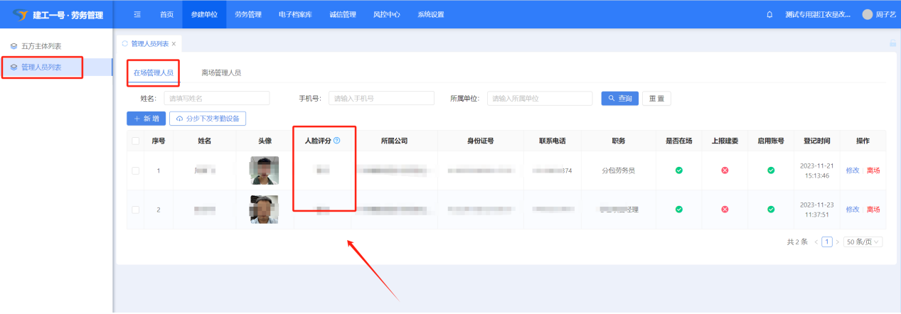 注:下发考勤设备前请查看该管理人员人像评分
