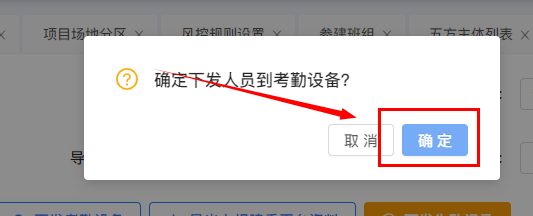 勾选管理人员,点击“下发考勤设备”-“确定”,进行人员信息下发考勤设备。