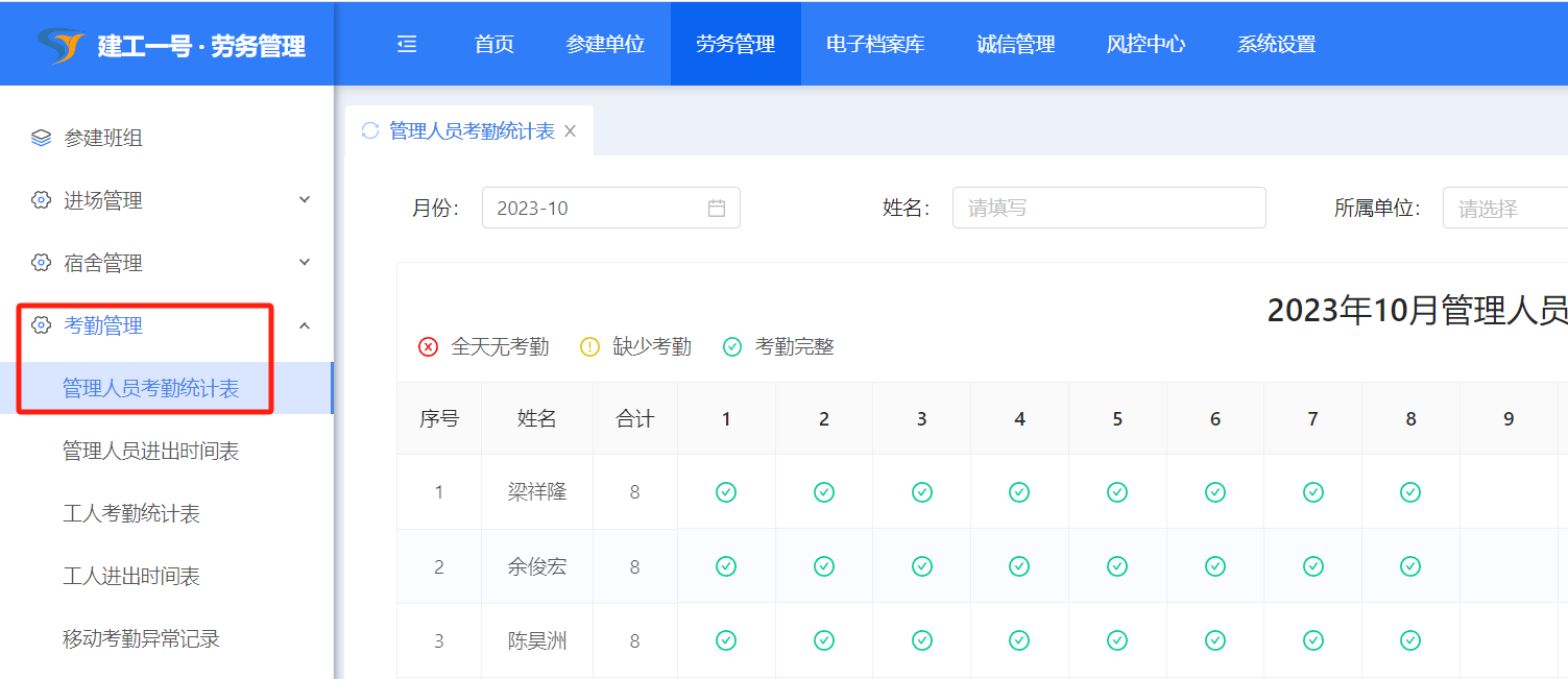 打开【劳务管理】-【考勤管理】-【管理人员考勤统计表】,可筛选班组和月份查看管理人员考勤统计情况