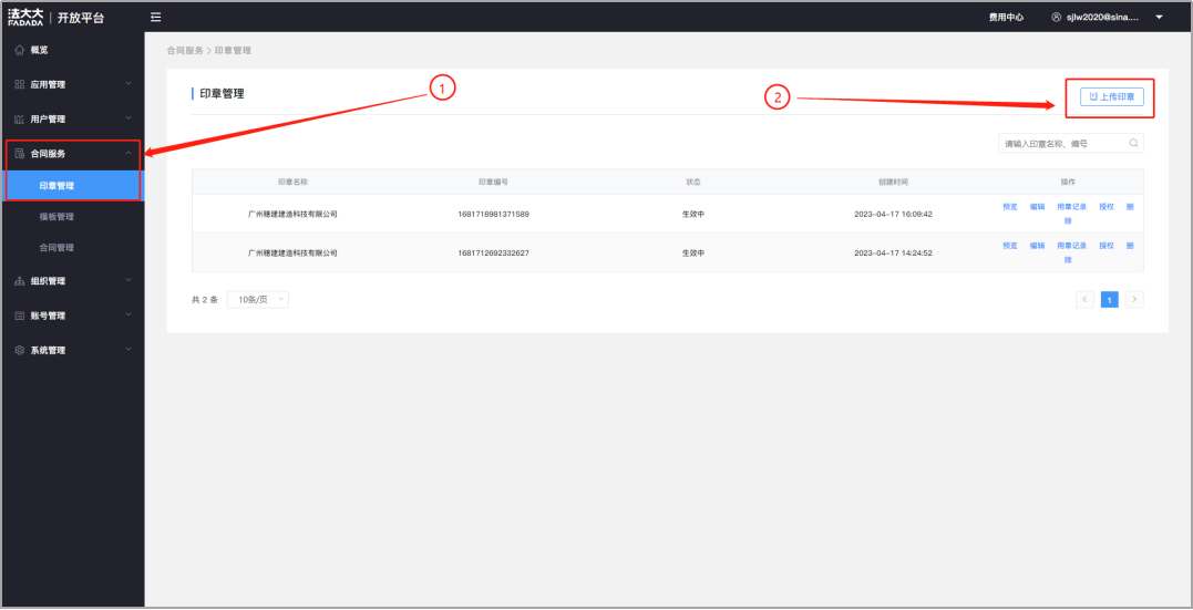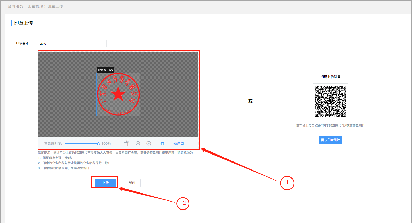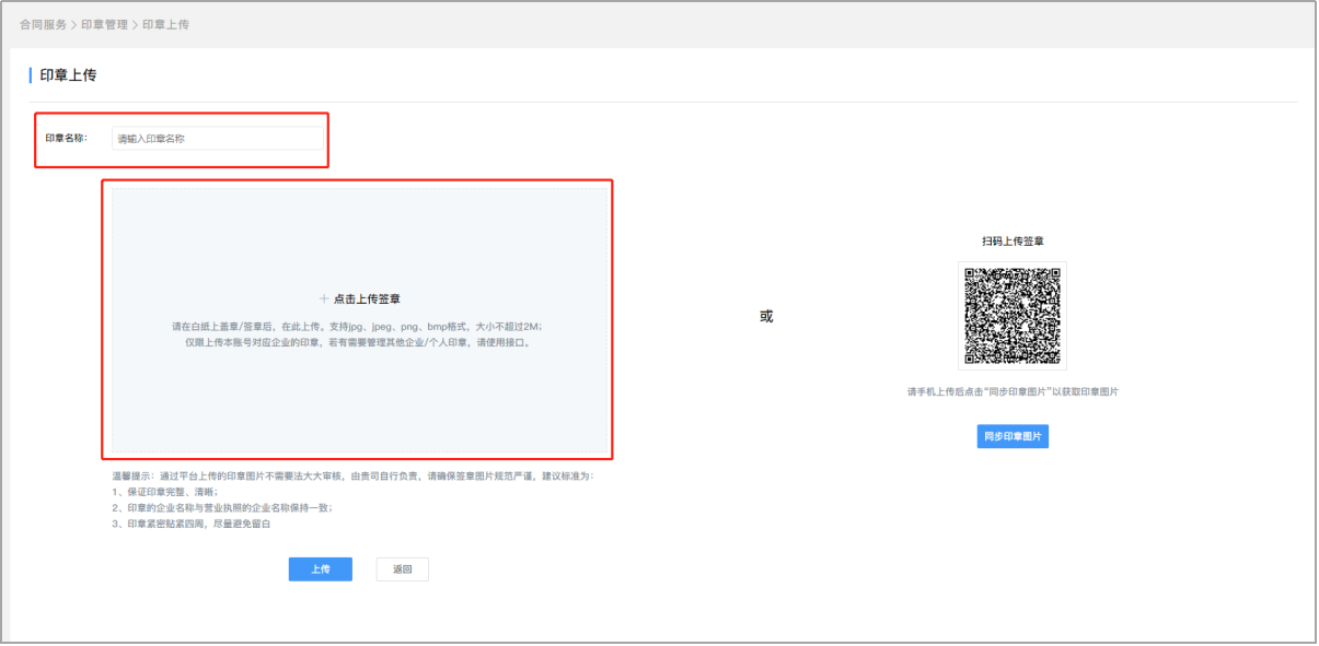 (3)打开【合同服务】-【印章管理】,点击【上传印章】
