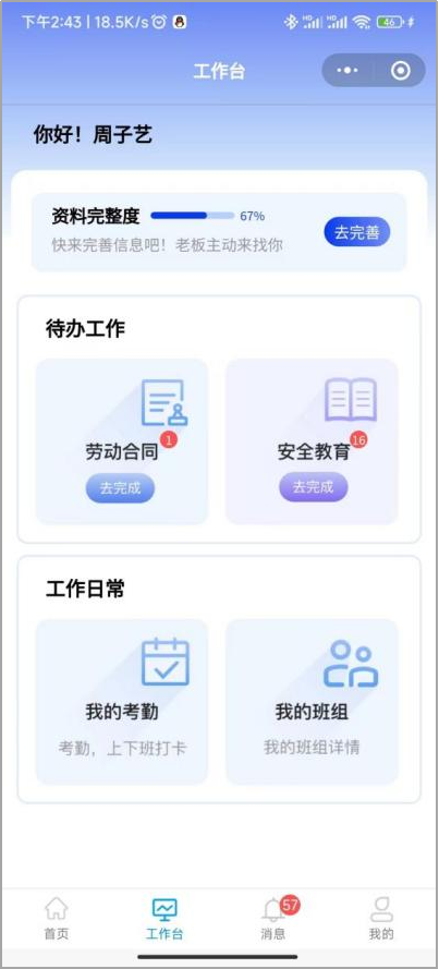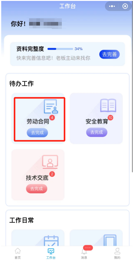 (1)人员在完成实名认证后,系统自动发起电子合同,进入工作台 - 代办工作 - 劳动合同