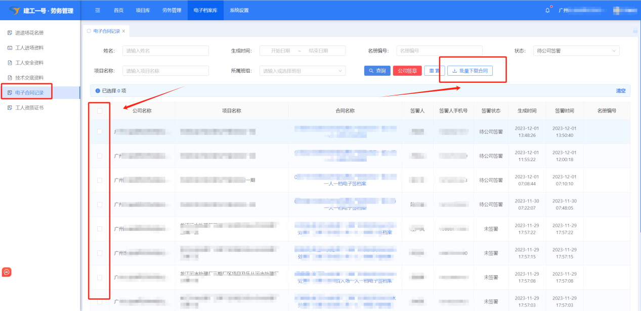 (3)资料归档,勾选需要下载的人员,点击批量下载合同按钮即可下载:
