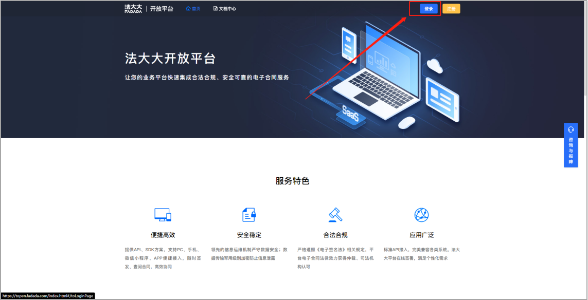 (1)浏览器打开法大大官网https://topen.fadada.com/index.html#/portal/home