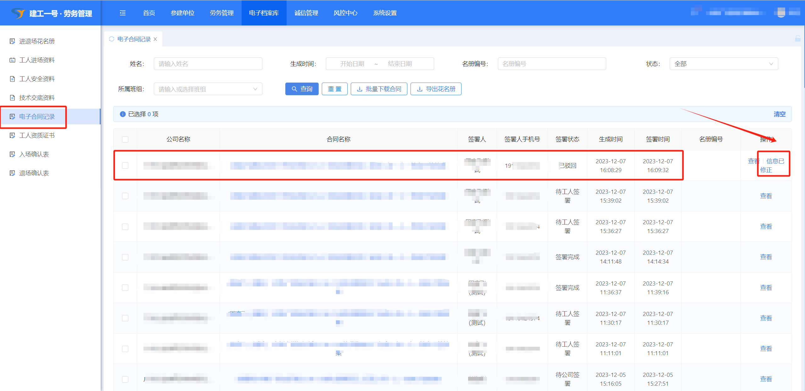 工人修改信息后,劳务员对驳回的合同进行上报,点击”信息已修正“按钮则会生成一条新的待工人签署的电子合同,原有的电子合同状态变更为已作废