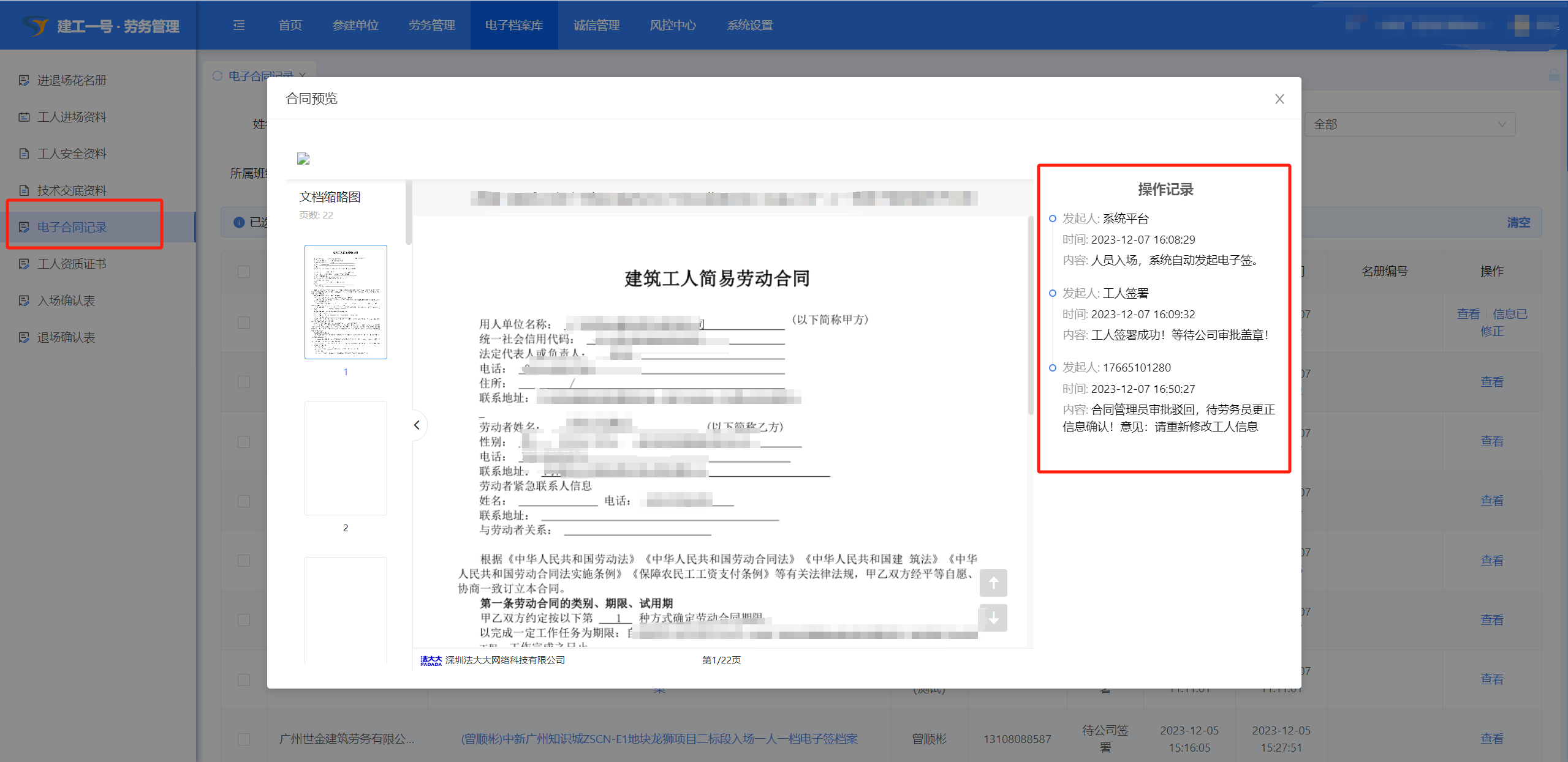 入场审批通过后,请引导工人进行电子合同内容核对及签署!