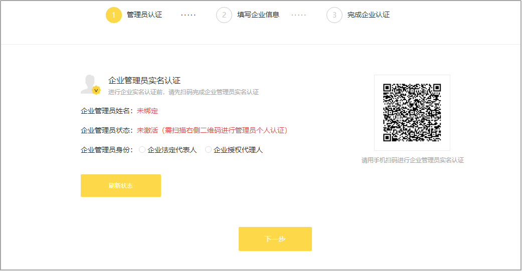 (1)通过穗建提供的链接进入账号开通页面进入认证页面后,需选择认证身份:法定代表人/授权代理人扫描右侧二维码,在移动端完成企业管理员个人认证
