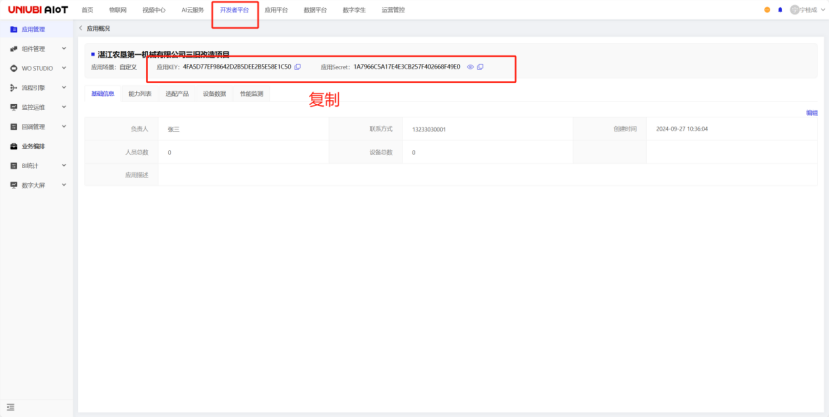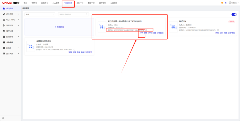 4.找到刚刚创建的应用–点击详情进入详情页–复制应用ID、应用key、应用Secret