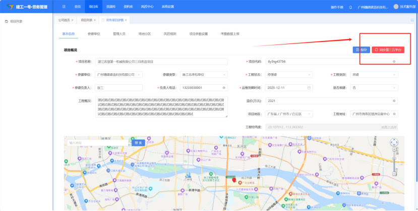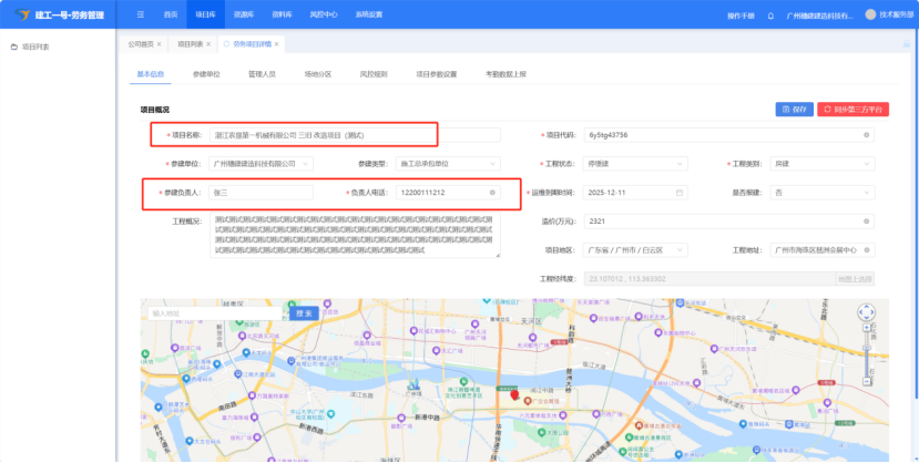 3.基础信息创建–输入对应建工一号项目名称、参建负责人及联系方式