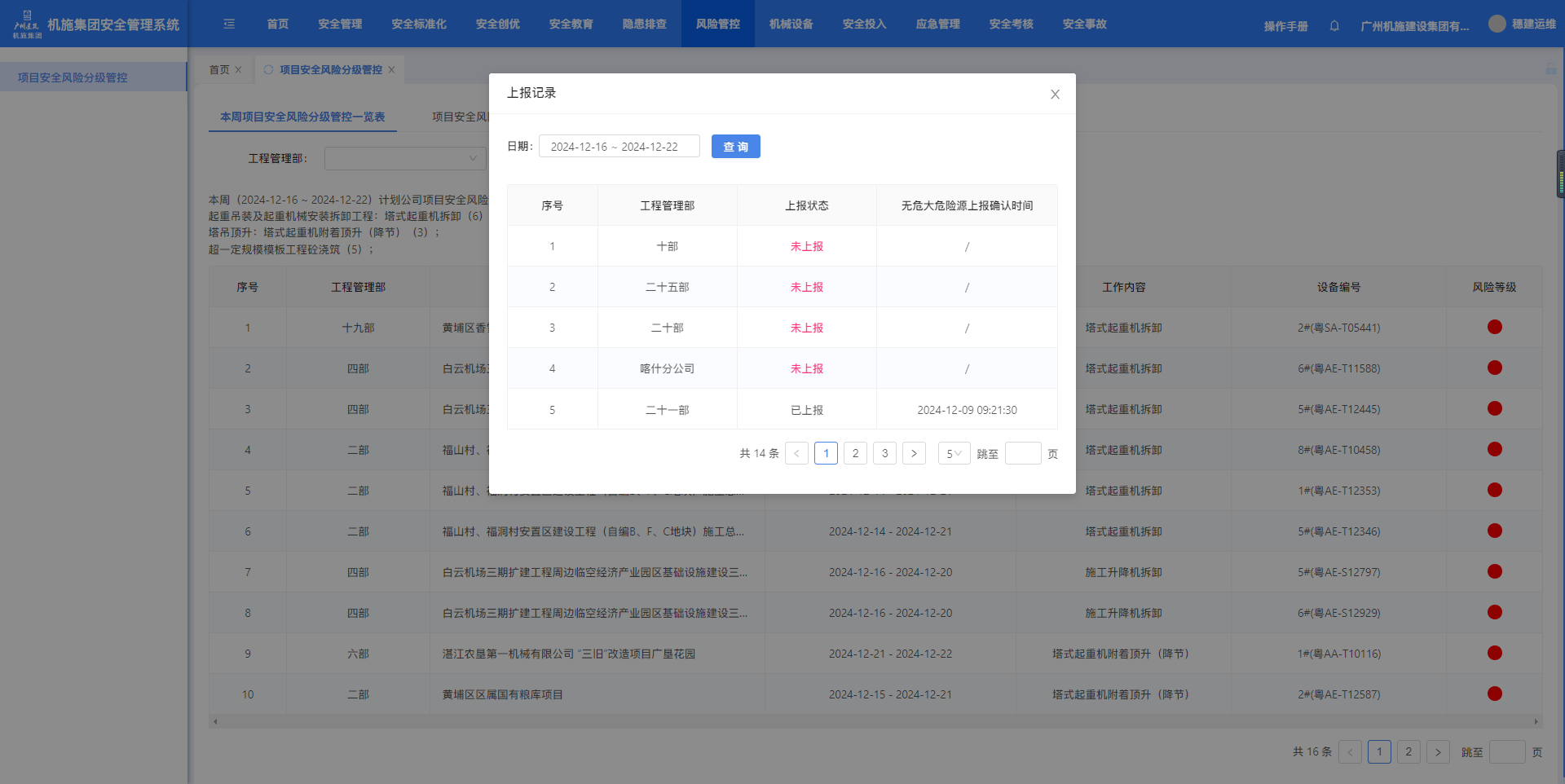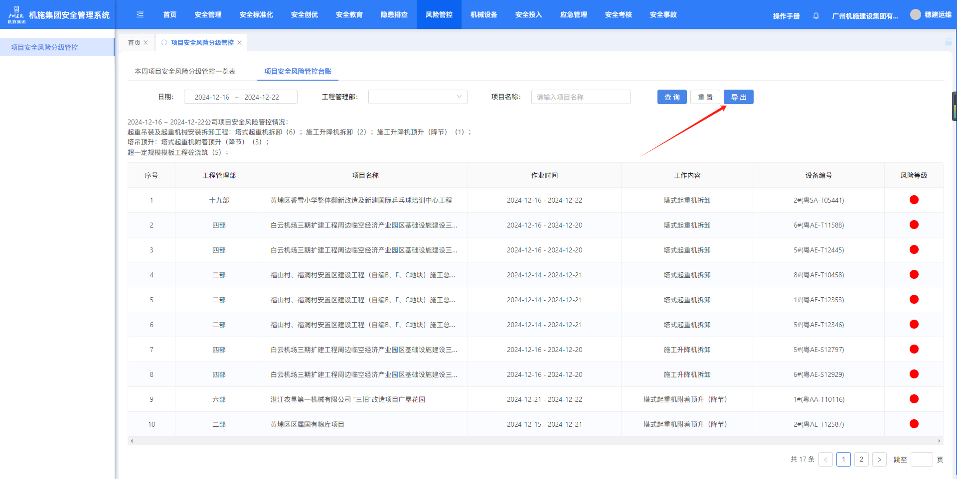 打开“风险管控-项目安全风险分级管控-本周项目风险分级管控”,该页面会展示本周项目风险分级管控的上报情况,点击“上报记录”可查询个工程管理部上报时间和是否上报。打开“风险管控-项目安全风险分级管控-项目安全风险管控台账”,点击“导出”可导出台账。作者:周子艺 创建时间:2024-11-21 09:12最后编辑:周子艺 更新时间:2025-04-22 14:01