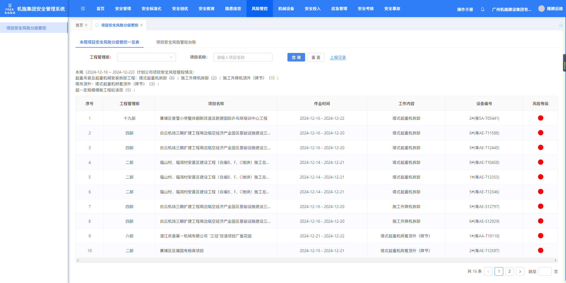 目录 搜索 展开 机施安全部功能操作说明一、安全管理1、项目管理2、安全管理月报3、安全责任4、规范及通知文件5、安全管理制度及工作指引6、企业证件及安全管理机构7、动态扣分台账二、安全标准化三、安全创优1、在建项目安全创优2、项目安全创优台账3、省双优检管理4、创优证书列表四、安全教育1、在线教育设置2、公司年度安全教育3、安全技术交底模板管理及配置五、隐患排查1、安全隐患排查2、安全验收管理六、风险管控七、机械设备八、安全投入九、应急管理十、安全考核十一、安全事故工程管理部功能操作说明一、安全管理1、项目管理2、安全管理月报3、安全责任4、规范及通知文件5、安全管理制度及工作指引6、动态扣分台账二、安全标准化三、安全创优1、在建项目安全创优2、项目安全创优台账3、省双优检管理四、安全教育五、隐患排查1、安全隐患排查2、安全验收管理六、风险管控七、机械设备八、安全投入九、应急管理十、安全考核项目部功能操作说明一、安全管理1、安全管理月报2、安全责任3、规范及通知文件4、安全管理制度及工作指引5、动态扣分台账6、施工安全日志二、安全标准化三、安全创优1、在建项目安全创优2、项目安全创优台账3、省双优检管理四、安全教育五、隐患排查1、安全隐患排查2、安全验收管理六、风险管控七、机械设备八、安全投入九、应急管理 暂无相关搜索结果! 阅读次数:200 本文档使用 MinDoc 发布 六、风险管控 打开“风险管控-项目安全风险分级管控-本周项目风险分级管控”,该页面会展示本周项目风险分级管控的上报情况,点击“上报记录”可查询个工程管理部上报时间和是否上报。打开“风险管控-项目安全风险分级管控-项目安全风险管控台账”,点击“导出”可导出台账。作者:周子艺 创建时间:2024-11-21 09:12最后编辑:周子艺 更新时间:2025-04-22 14:01