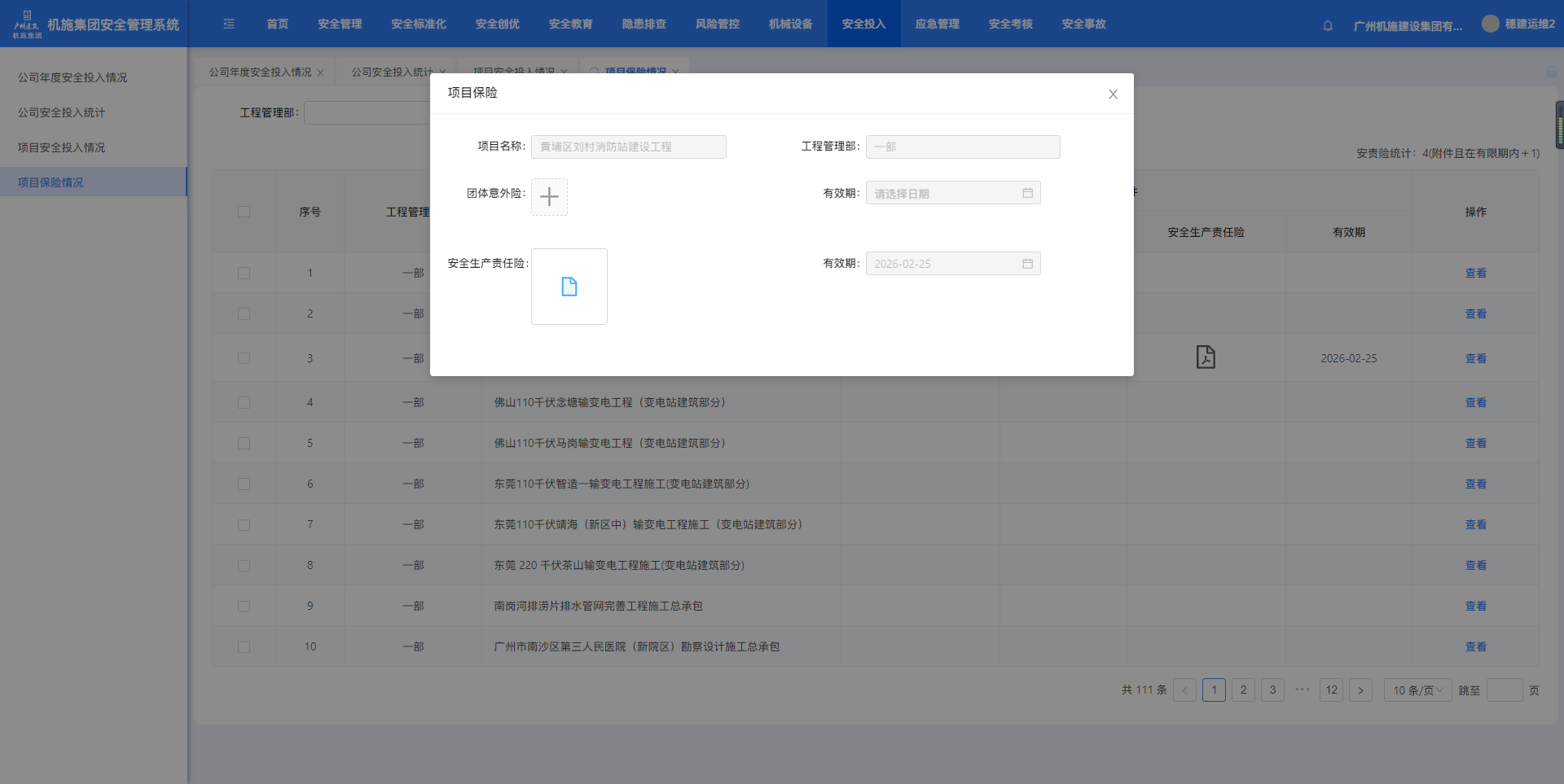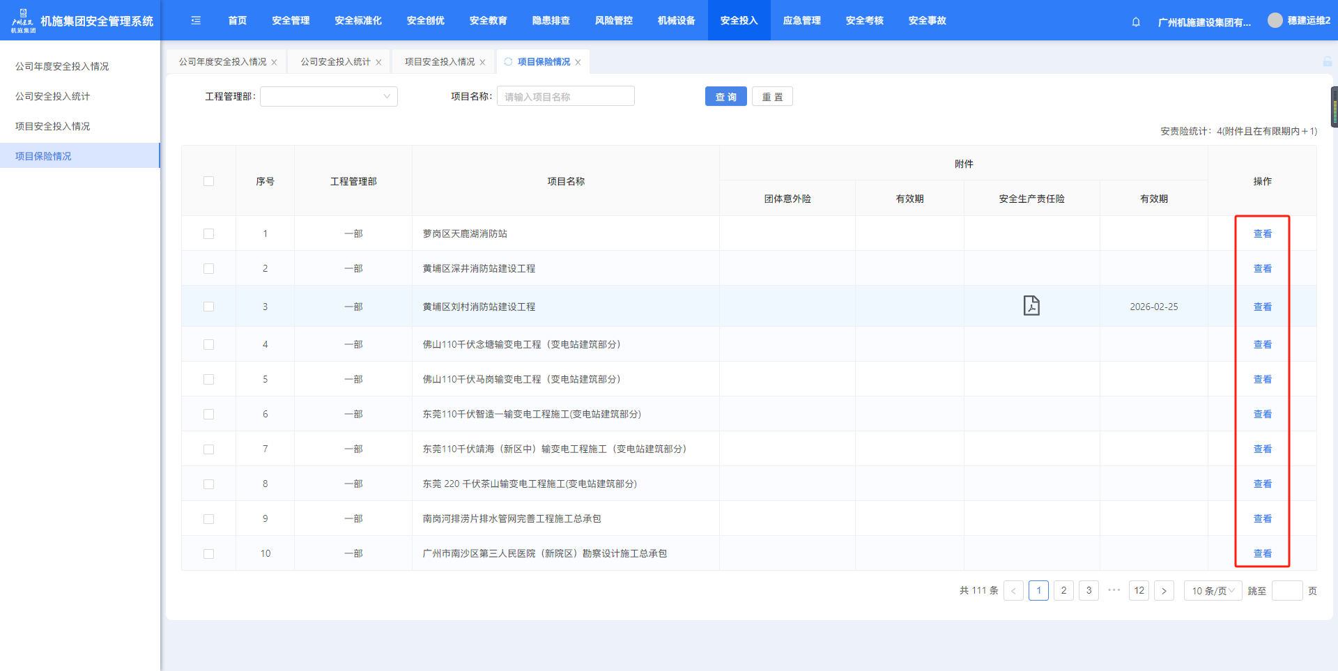 点击菜单进入项目保险情况页面,点击“查询”按筛选条件查询。点击“查看”查看项目保险信息。
