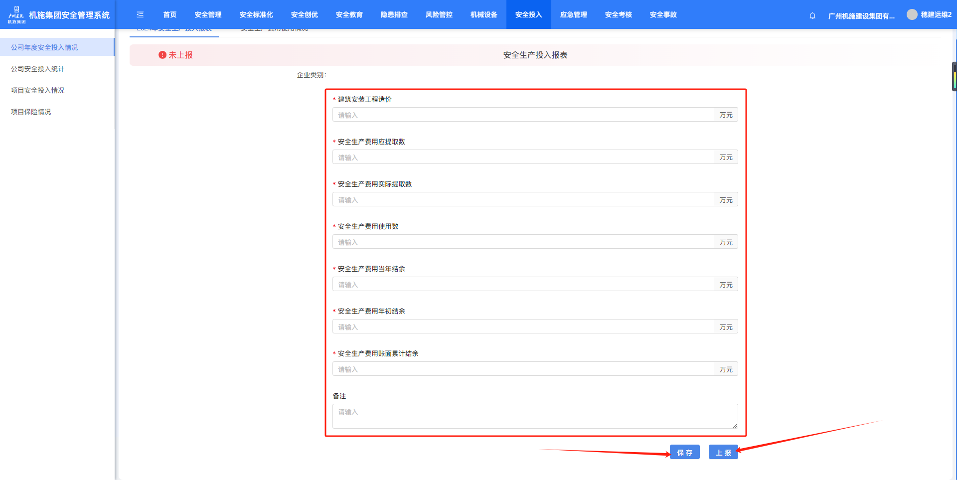 输入安全生成投入情况,点击“保存”可保存报表,保存后能再次编辑,点击“上报”后无法再次编辑