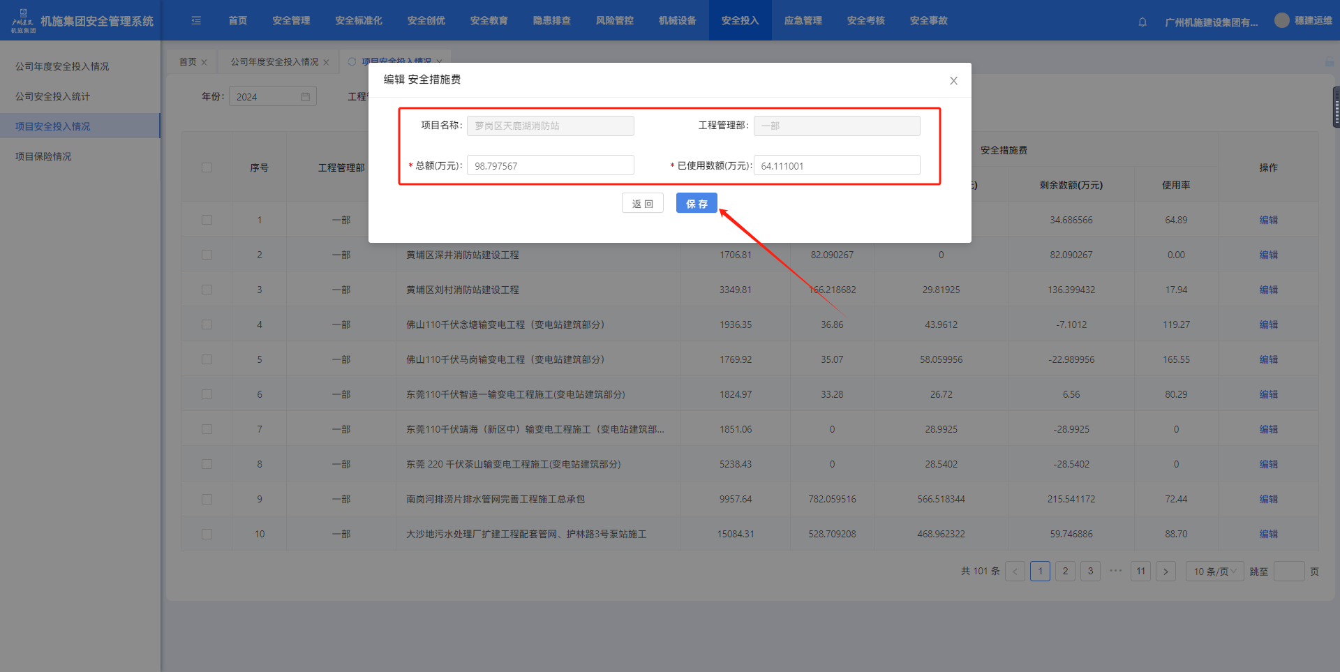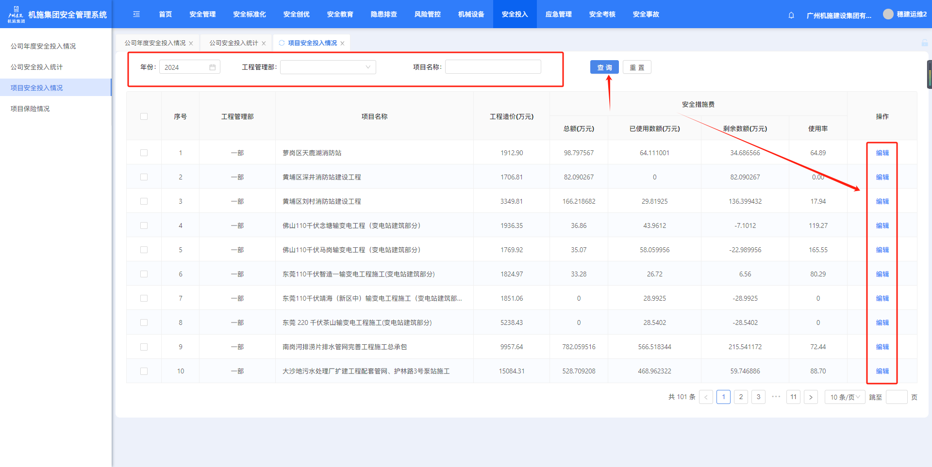 点击菜单进入项目安全投入情况页面,筛选项目名称、工程管理部、时间,点击“查询”按筛选条件查询。点击“编辑”进入项目安全投入编辑页面。