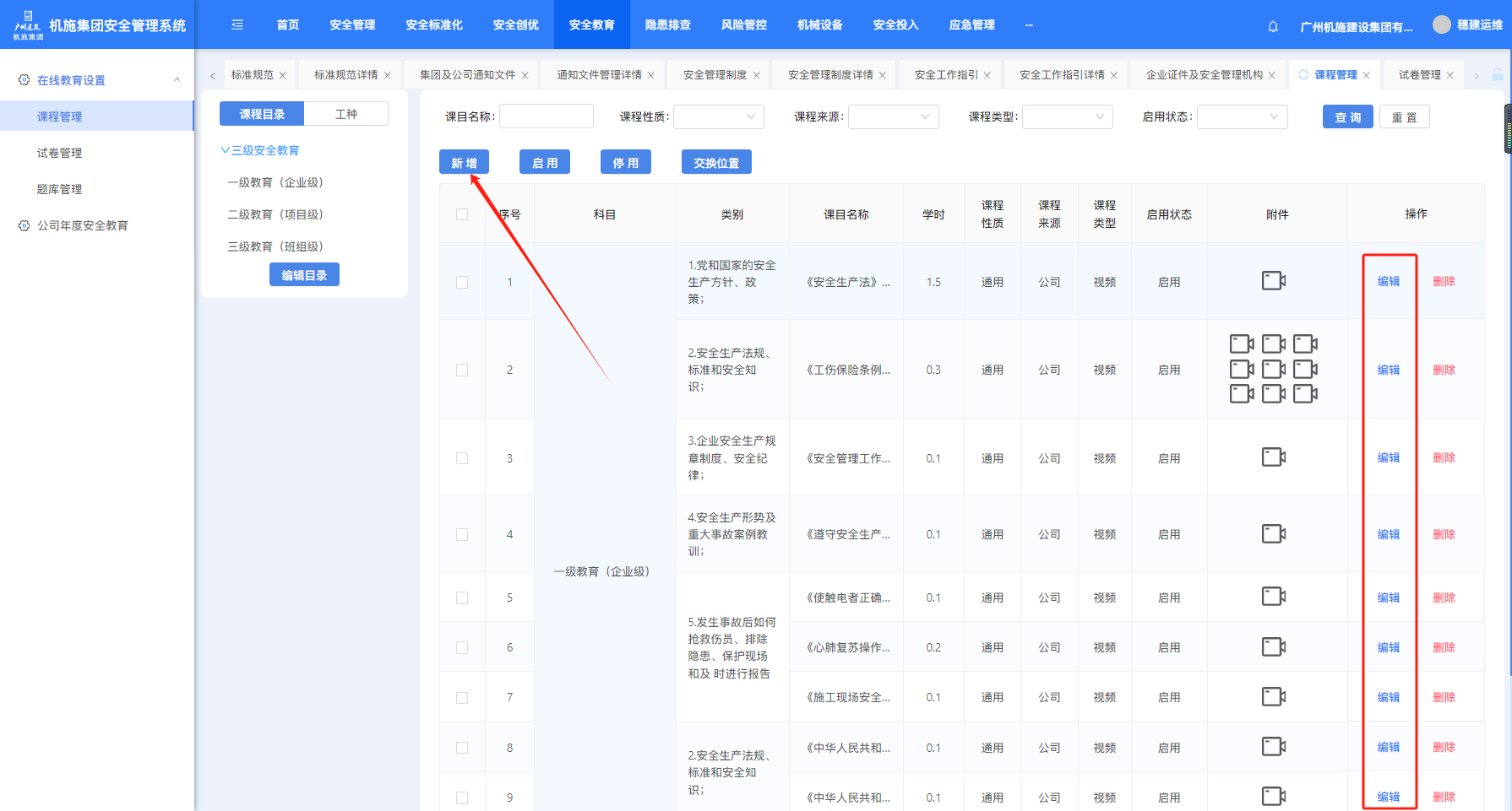 打开“在线教育”-“课程管理”页面,点“新增”可创建课程,“编辑”可对已创建的课程进行编辑。