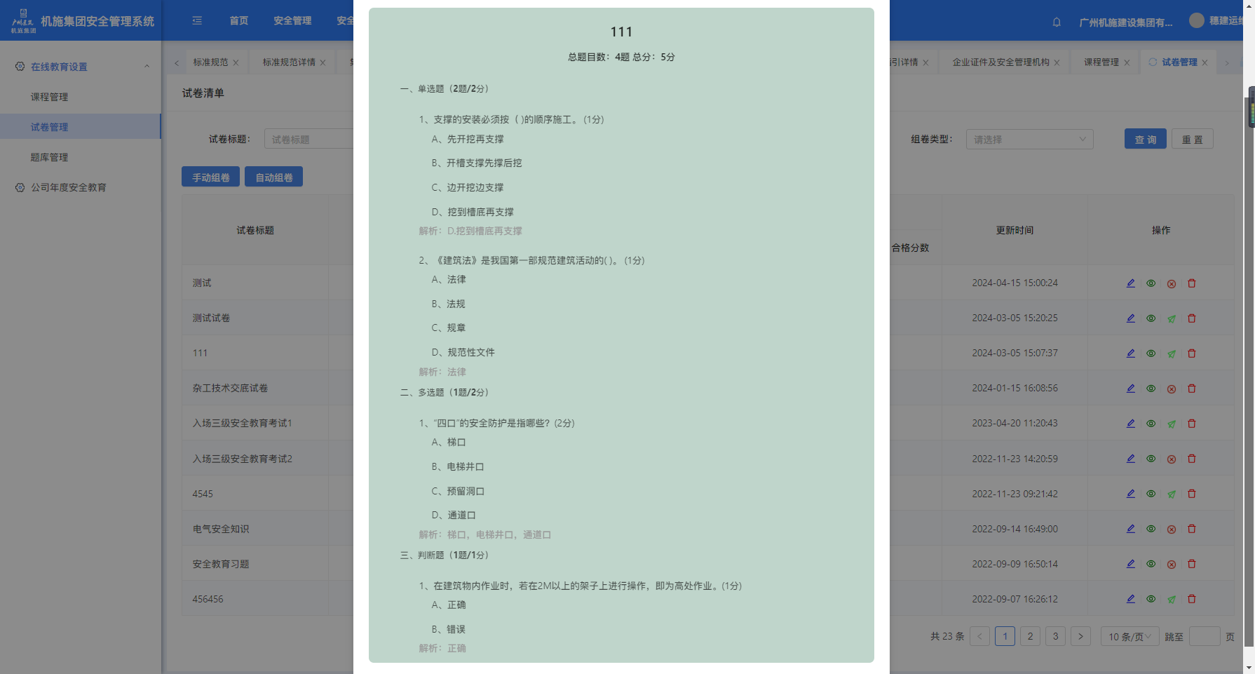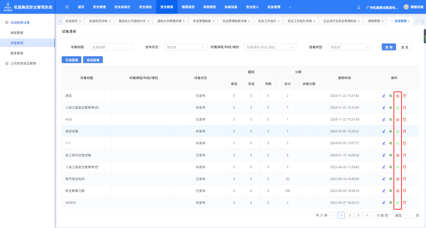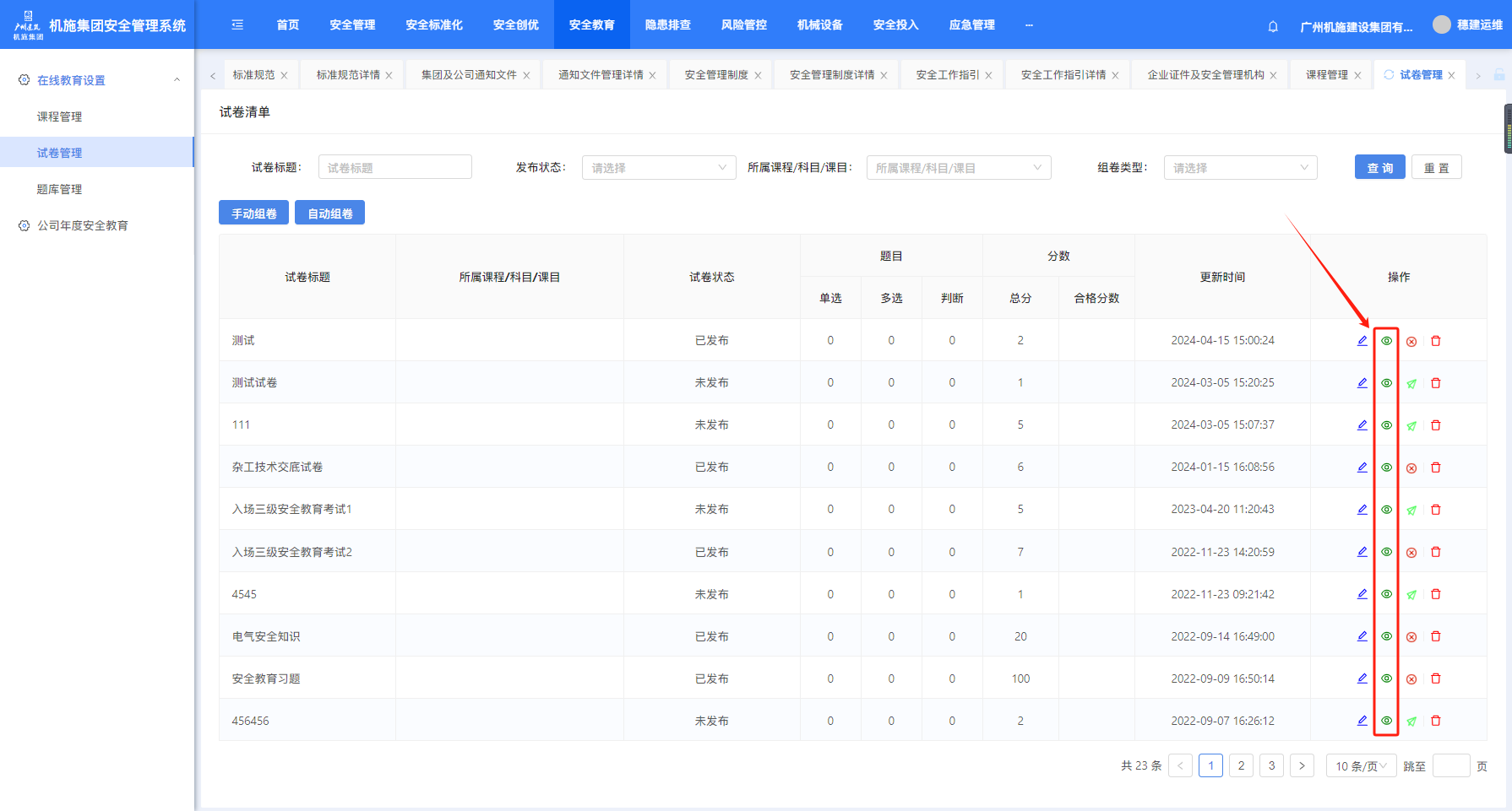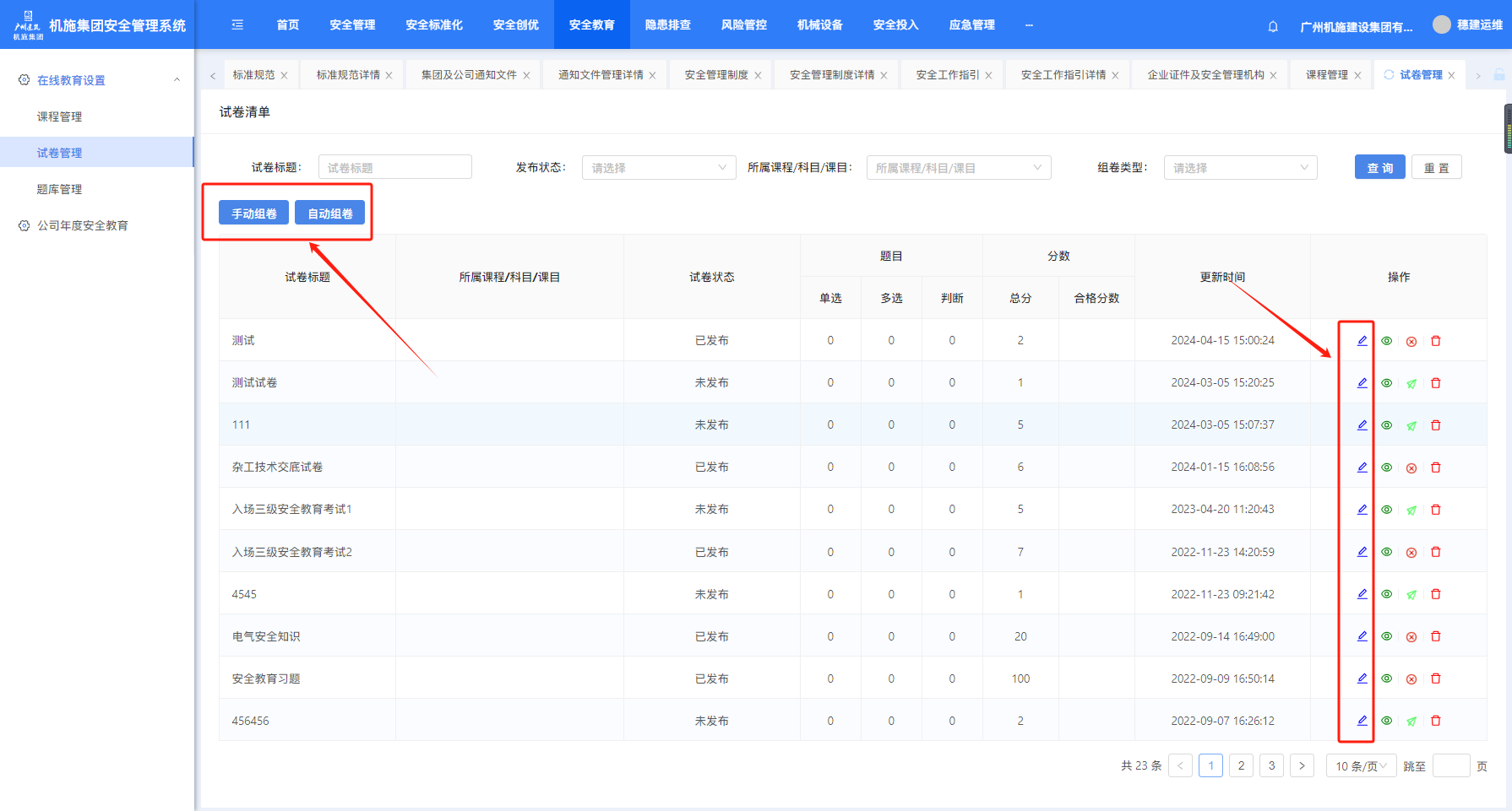 打开“在线教育”-“试卷管理”页面,点“手动组卷”或“自动组卷”可创建课程,“编辑”可对已创建的课程进行编辑。