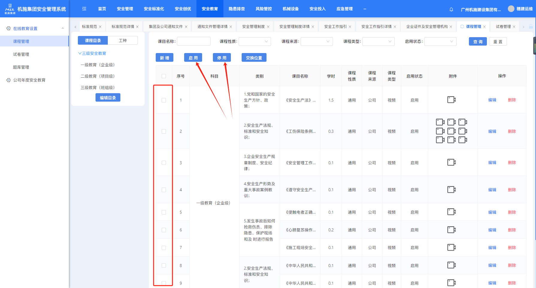 勾选课程点击“启动”或“停用”,可对课程启用状态进行变更