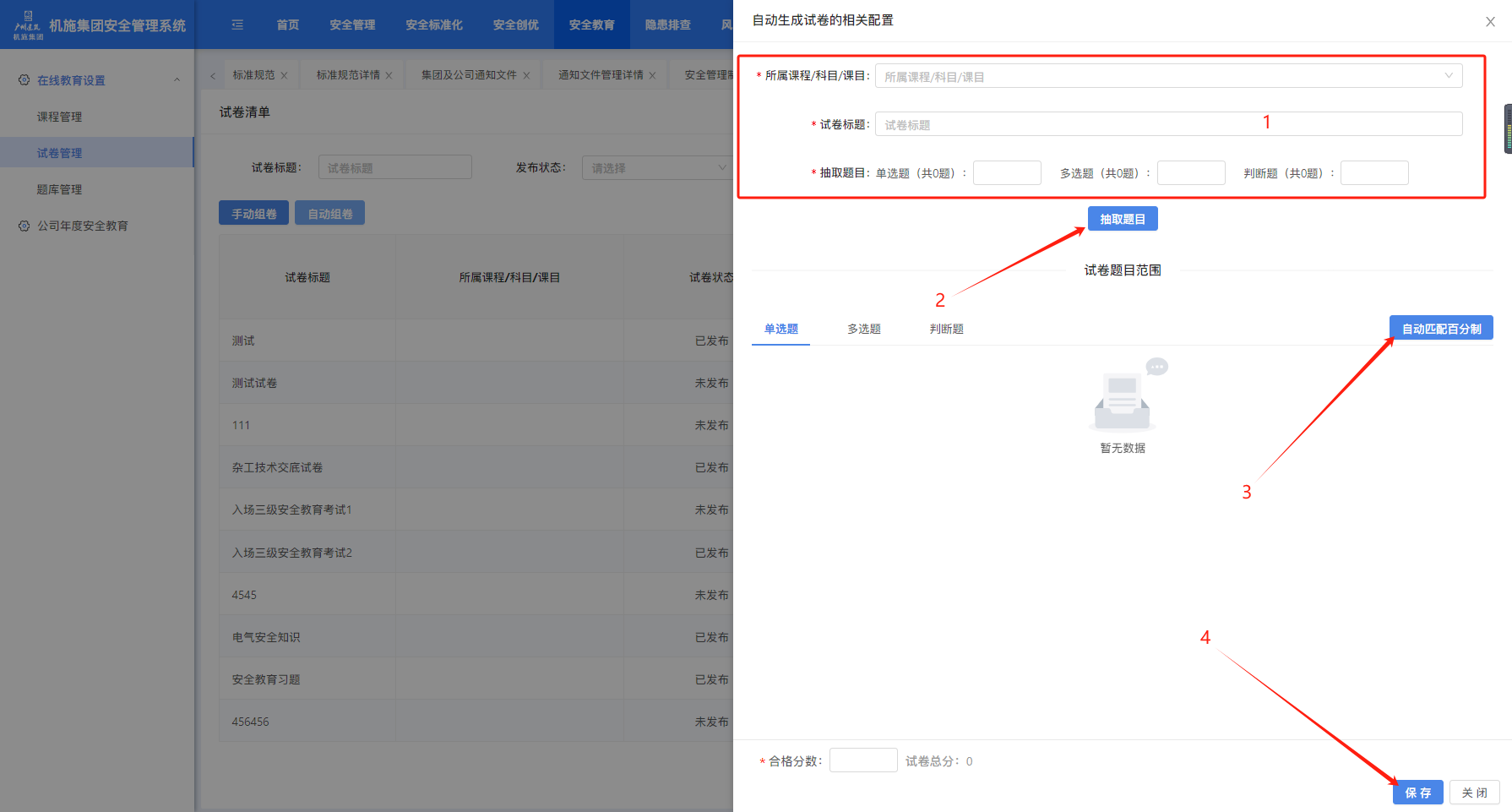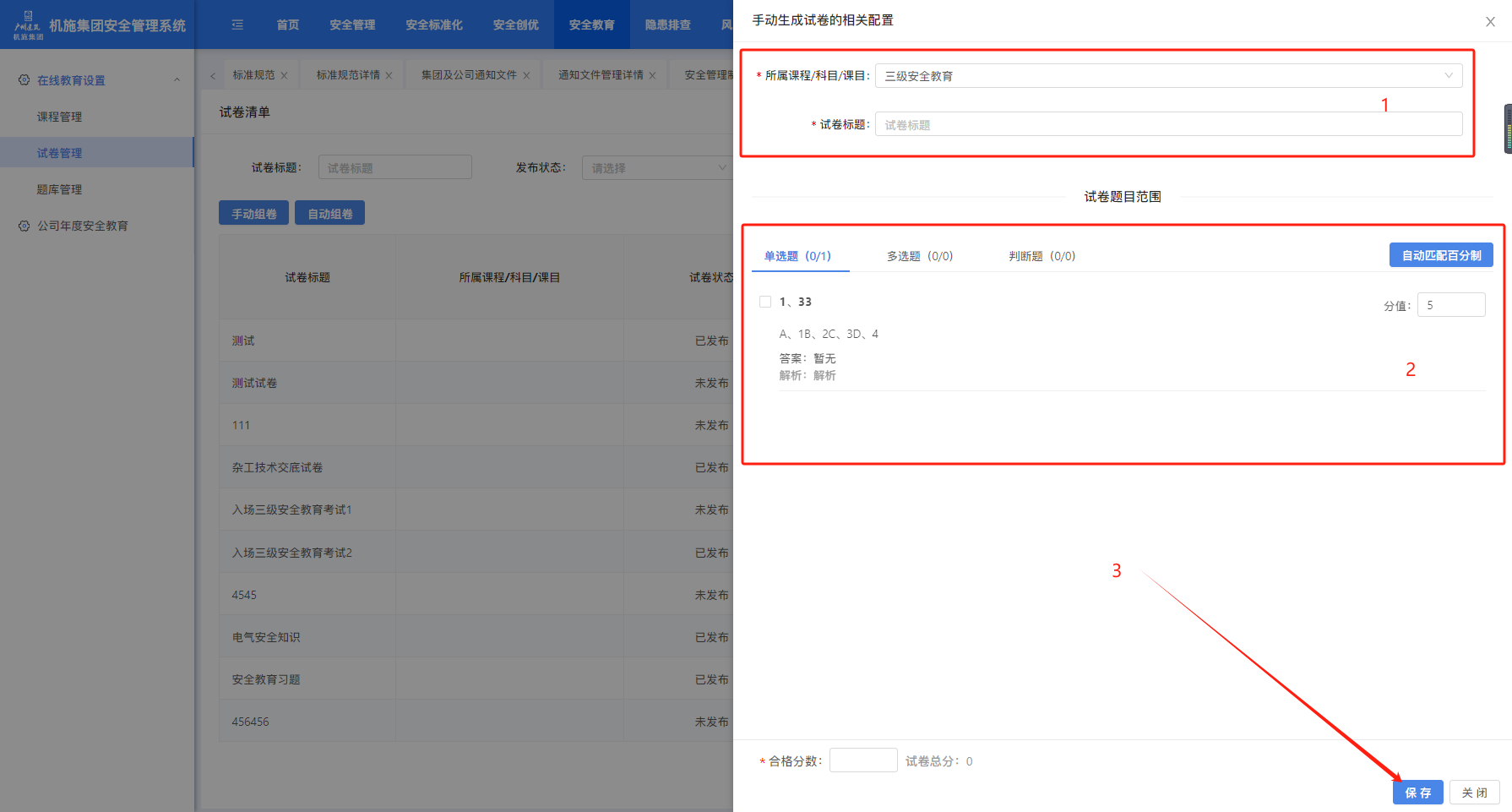 手动组卷,先选择所属课程/科目/课目,输入试卷标题,选择题目,设置每道题目的分数或点击“自动匹配百分制”对选题目已100分制均分,自动设置每道题目分数,点击“保存”完成组卷。
