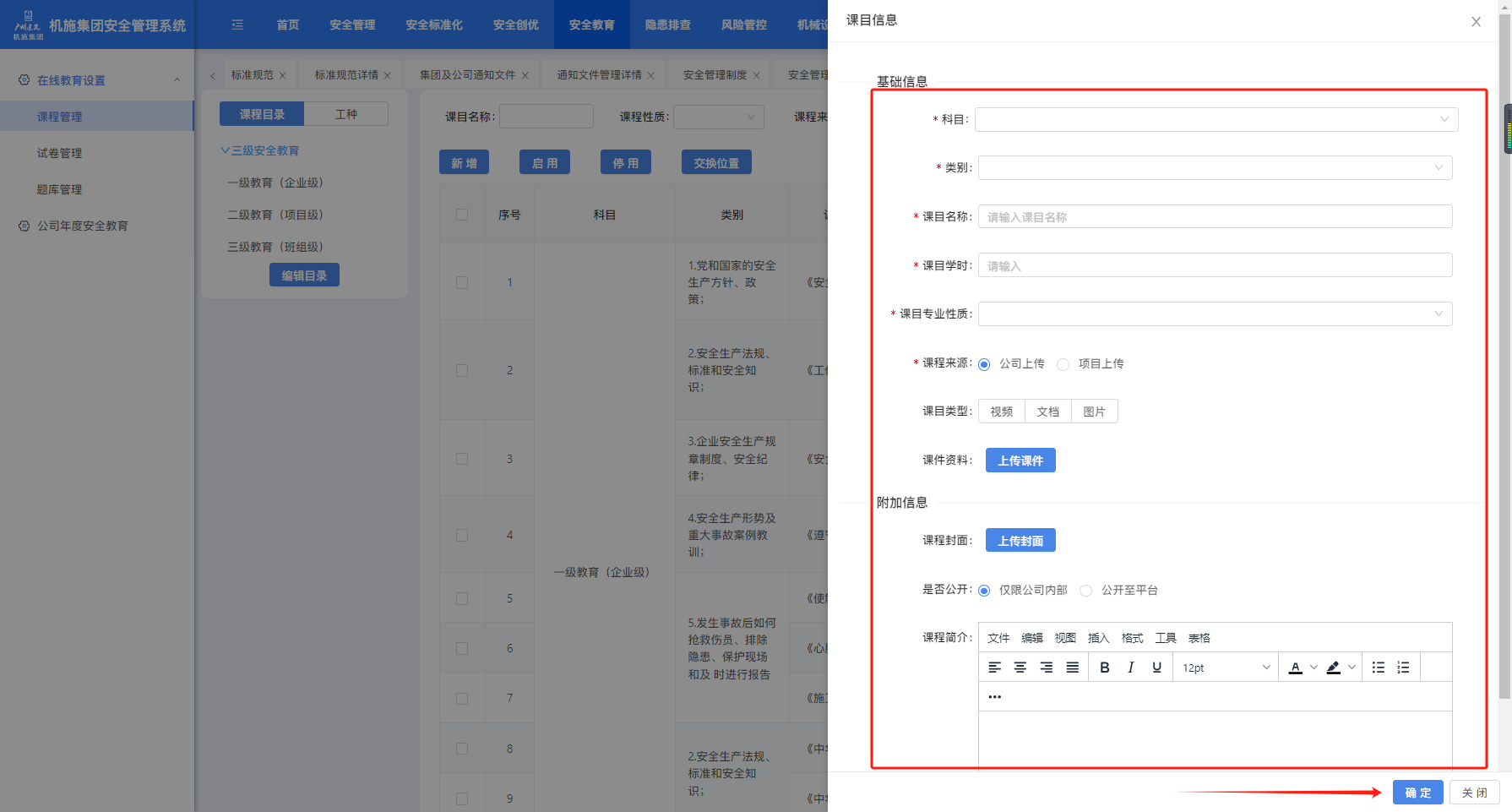 填写课目内容上传附件,点击“确定:完成课程创建