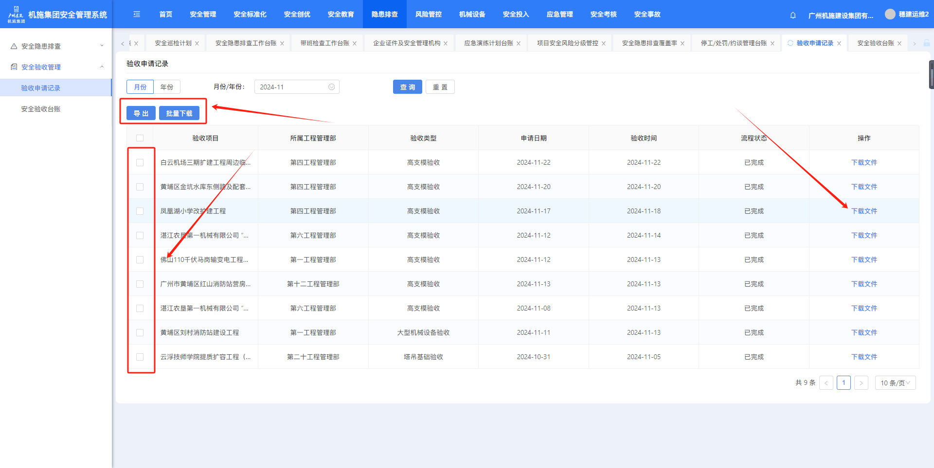 5.2.1.验收申请记录点击“安全验收管理-验收申请记录”,筛选年份查询。点击【导出】可以导出验收申请记录。点击【批量下载】可下载验收文件。 5.2.2.安全验收台账点击“安全验收管理-安全验收台账”,筛选年份查询。点击【导出】可以导出安全验收台账。作者:周子艺 创建时间:2024-11-25 11:28最后编辑:周子艺 更新时间:2025-04-22 14:01