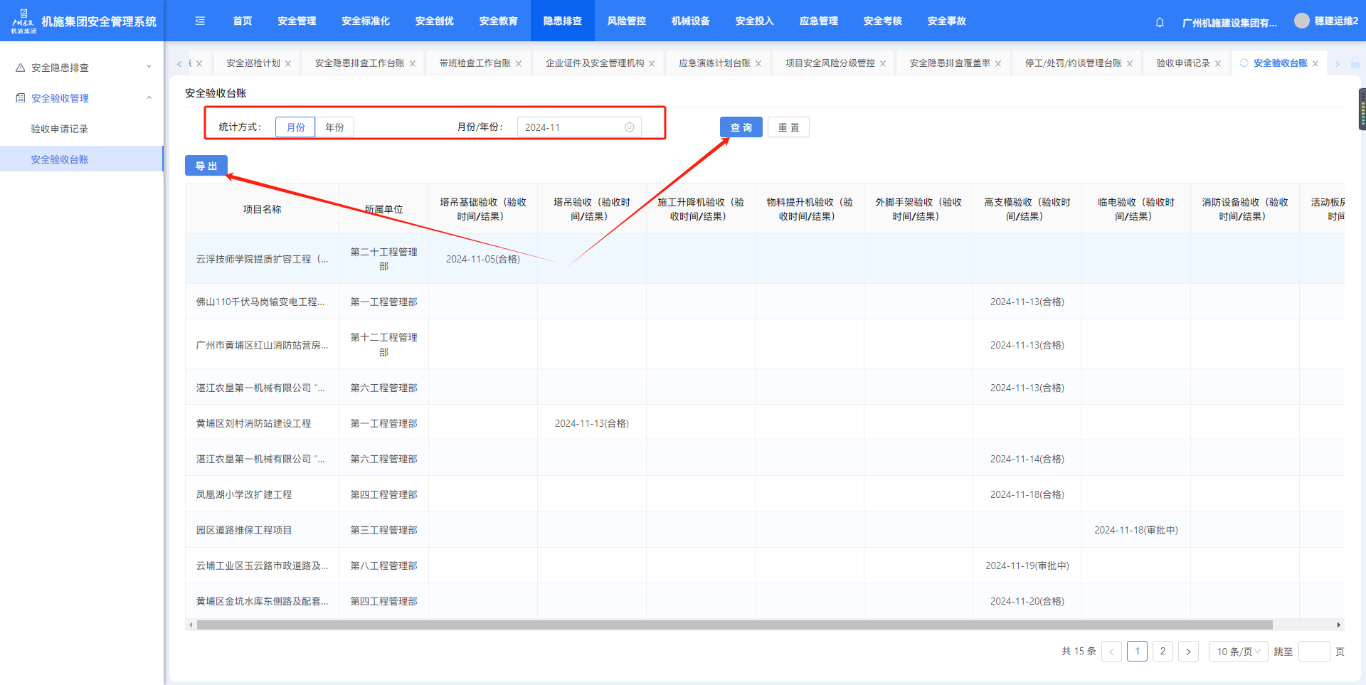 目录 搜索 展开 机施安全部功能操作说明一、安全管理1、项目管理2、安全管理月报3、安全责任4、规范及通知文件5、安全管理制度及工作指引6、企业证件及安全管理机构7、动态扣分台账二、安全标准化三、安全创优1、在建项目安全创优2、项目安全创优台账3、省双优检管理4、创优证书列表四、安全教育1、在线教育设置2、公司年度安全教育3、安全技术交底模板管理及配置五、隐患排查1、安全隐患排查2、安全验收管理六、风险管控七、机械设备八、安全投入九、应急管理十、安全考核十一、安全事故工程管理部功能操作说明一、安全管理1、项目管理2、安全管理月报3、安全责任4、规范及通知文件5、安全管理制度及工作指引6、动态扣分台账二、安全标准化三、安全创优1、在建项目安全创优2、项目安全创优台账3、省双优检管理四、安全教育五、隐患排查1、安全隐患排查2、安全验收管理六、风险管控七、机械设备八、安全投入九、应急管理十、安全考核项目部功能操作说明一、安全管理1、安全管理月报2、安全责任3、规范及通知文件4、安全管理制度及工作指引5、动态扣分台账6、施工安全日志二、安全标准化三、安全创优1、在建项目安全创优2、项目安全创优台账3、省双优检管理四、安全教育五、隐患排查1、安全隐患排查2、安全验收管理六、风险管控七、机械设备八、安全投入九、应急管理 暂无相关搜索结果! 阅读次数:176 本文档使用 MinDoc 发布 2、安全验收管理 5.2.1.验收申请记录点击“安全验收管理-验收申请记录”,筛选年份查询。点击【导出】可以导出验收申请记录。点击【批量下载】可下载验收文件。 5.2.2.安全验收台账点击“安全验收管理-安全验收台账”,筛选年份查询。点击【导出】可以导出安全验收台账。作者:周子艺 创建时间:2024-11-25 11:28最后编辑:周子艺 更新时间:2025-04-22 14:01