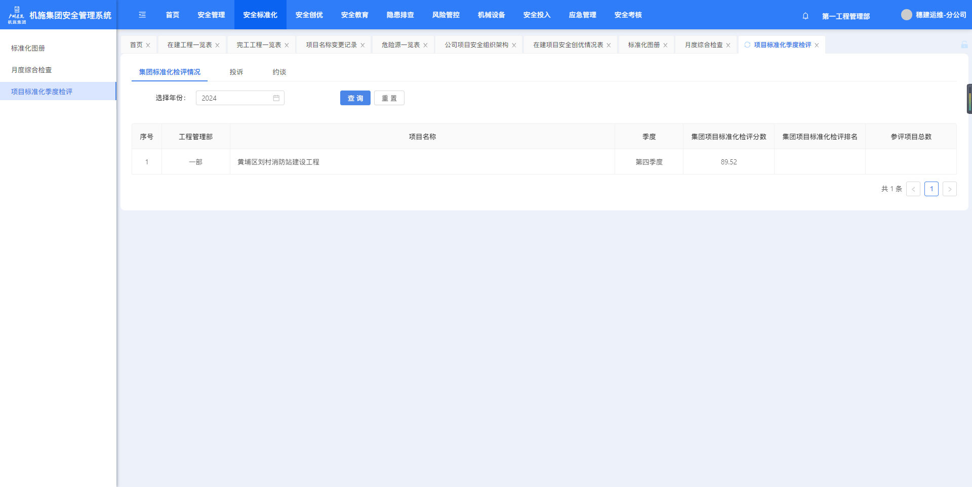 目录 搜索 展开 机施安全部功能操作说明一、安全管理1、项目管理2、安全管理月报3、安全责任4、规范及通知文件5、安全管理制度及工作指引6、企业证件及安全管理机构7、动态扣分台账二、安全标准化三、安全创优1、在建项目安全创优2、项目安全创优台账3、省双优检管理4、创优证书列表四、安全教育1、在线教育设置2、公司年度安全教育3、安全技术交底模板管理及配置五、隐患排查1、安全隐患排查2、安全验收管理六、风险管控七、机械设备八、安全投入九、应急管理十、安全考核十一、安全事故工程管理部功能操作说明一、安全管理1、项目管理2、安全管理月报3、安全责任4、规范及通知文件5、安全管理制度及工作指引6、动态扣分台账二、安全标准化三、安全创优1、在建项目安全创优2、项目安全创优台账3、省双优检管理四、安全教育五、隐患排查1、安全隐患排查2、安全验收管理六、风险管控七、机械设备八、安全投入九、应急管理十、安全考核项目部功能操作说明一、安全管理1、安全管理月报2、安全责任3、规范及通知文件4、安全管理制度及工作指引5、动态扣分台账6、施工安全日志二、安全标准化三、安全创优1、在建项目安全创优2、项目安全创优台账3、省双优检管理四、安全教育五、隐患排查1、安全隐患排查2、安全验收管理六、风险管控七、机械设备八、安全投入九、应急管理 暂无相关搜索结果! 阅读次数:140 本文档使用 MinDoc 发布 二、安全标准化 2.1.标准化图册“安全标准化”-“标准化图册”,点击“批量下载”可下载勾选项的附件。 2.2.月度综合检查“安全标准化”-“月度综合检查”,点击“导出”可导出月度计划表,点击操作的选项下载附件。 2.3.项目标准化季度检评“安全标准化”-“项目标准化季度检评”,投诉、约谈可以点击附件查看。作者:周子艺 创建时间:2024-11-26 10:57最后编辑:周子艺 更新时间:2025-04-22 14:01