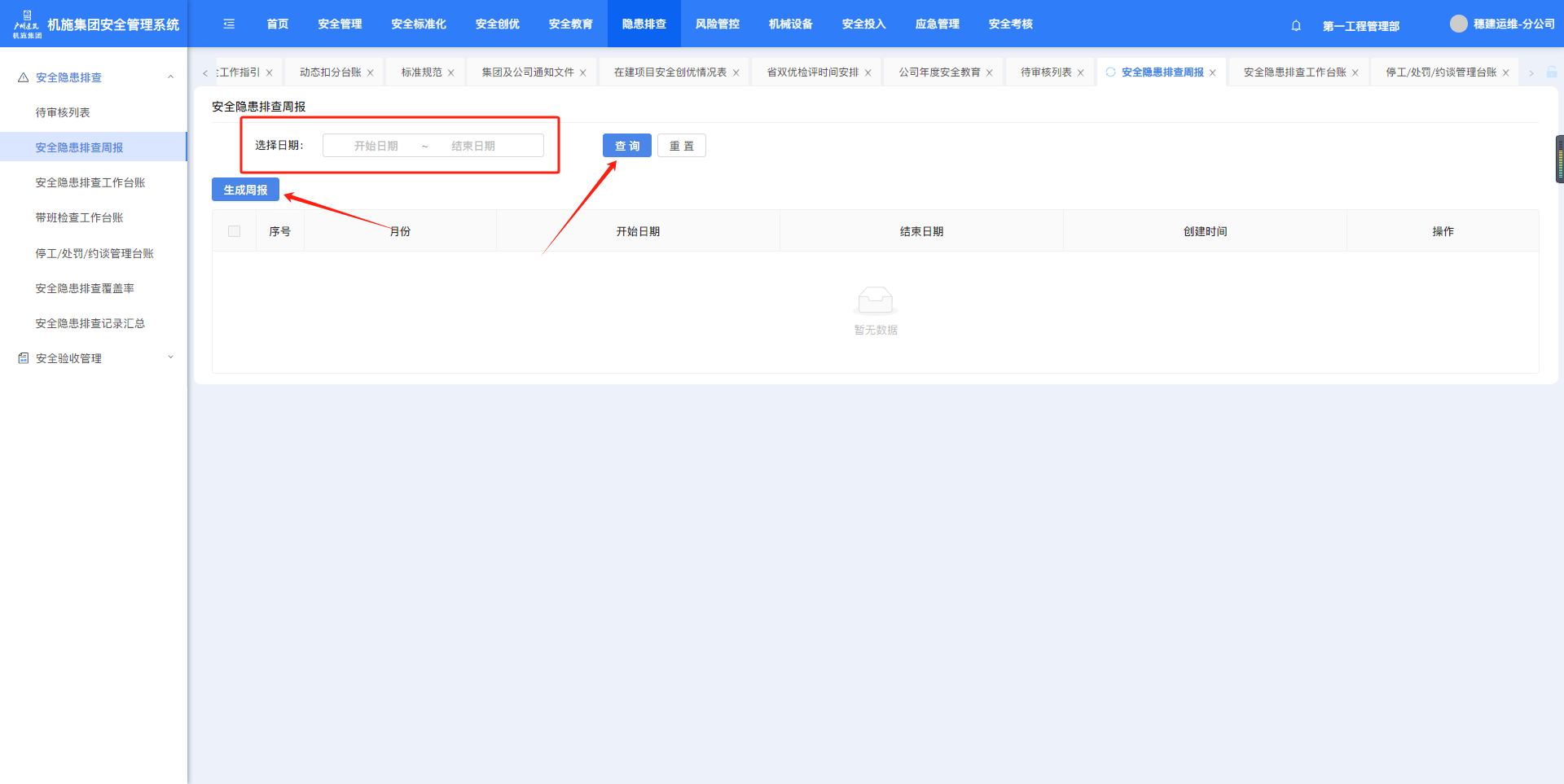 “隐患排查”-“安全隐患排查周报”,选择日期,点击“生成周报”可生成所选日期的安全隐患排查周报。