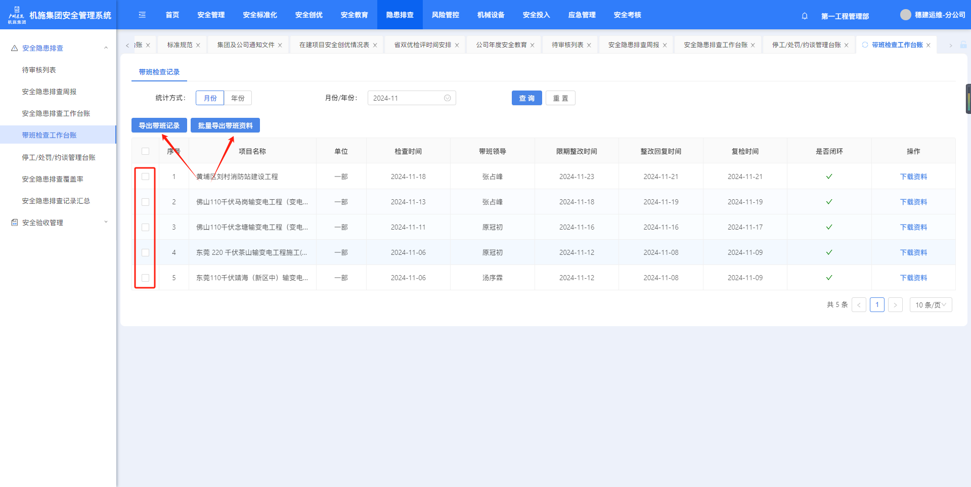 “隐患排查”-“带班检查工作台账”页面,按条件筛选,点击“导出代办记录”可导出台账,点击“批量导出带班资料”可下载勾选项的附件。