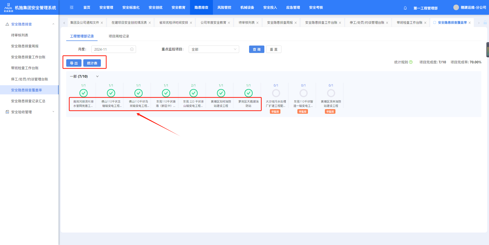 “隐患排查”-“安全隐患排查覆盖率”页面,按条件筛选,点击“导出”可导出台账,点击“统计表”可导出统计表。
