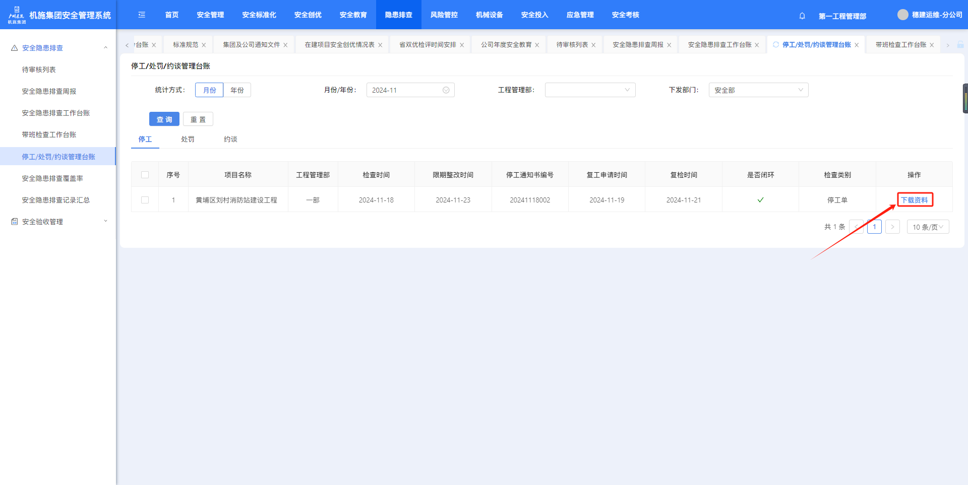 “隐患排查”-“停工/处罚/约谈管理台账”页面,点击“下载”可下载附件。