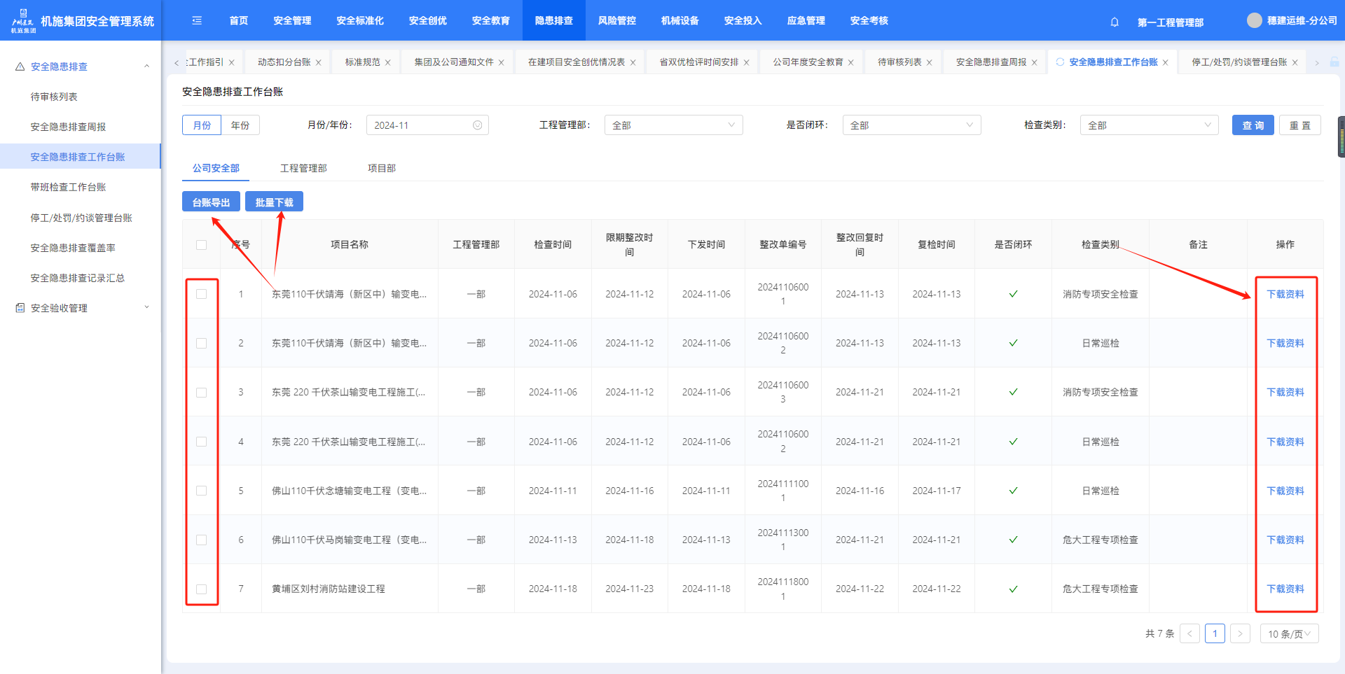 “隐患排查”-“安全隐患排查工作台账”页面,按条件筛选,点击“台账导出”可导出台账,点击“批量下载”可下载勾选项的附件。