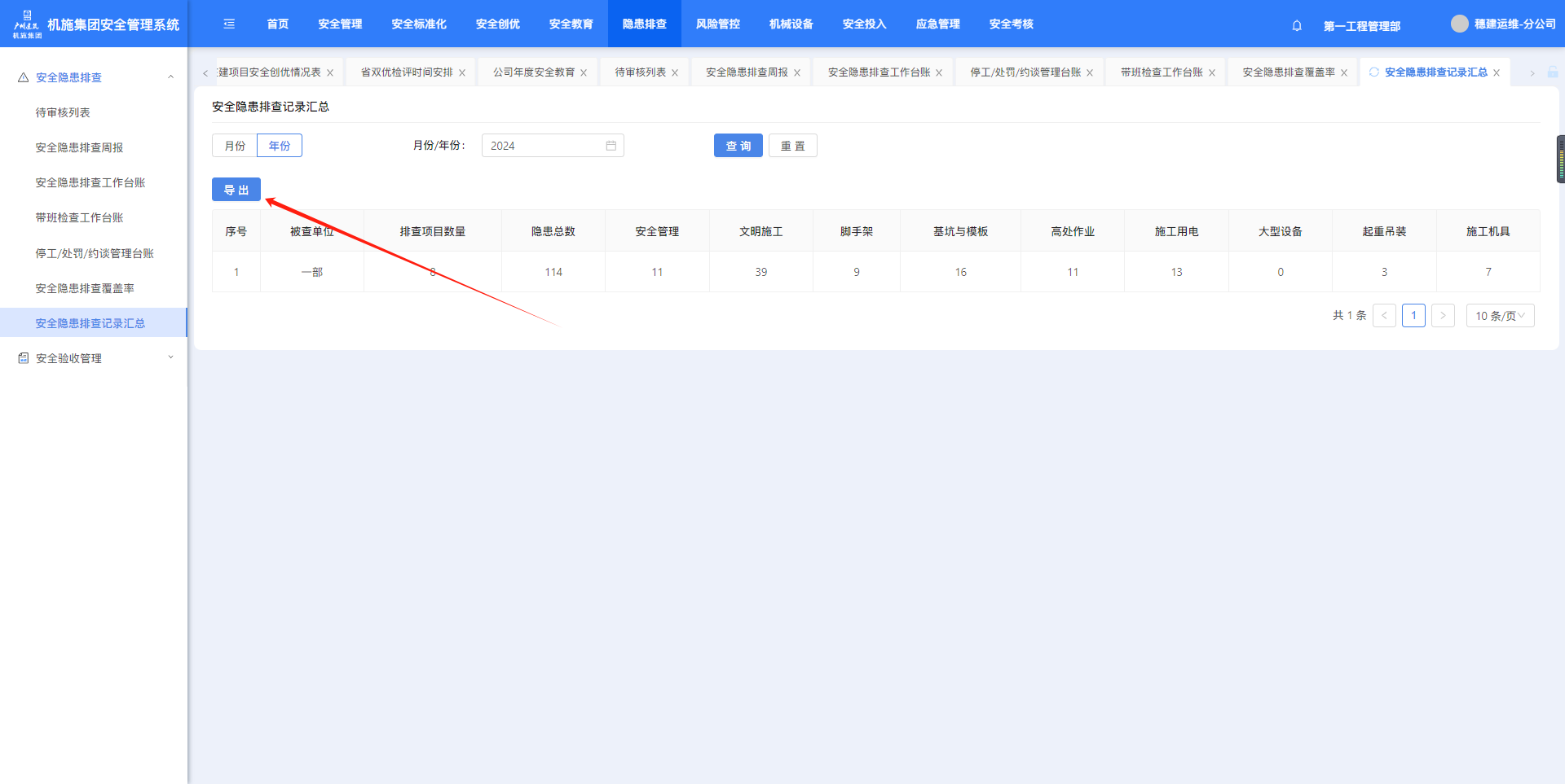 “隐患排查”-“安全隐患排查记录汇总”页面,按条件筛选,点击“导出”可导出台账。